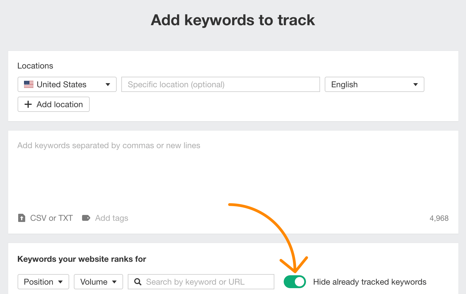 We’ve added a toggle so you can easily hide keywords you’re already tracking: