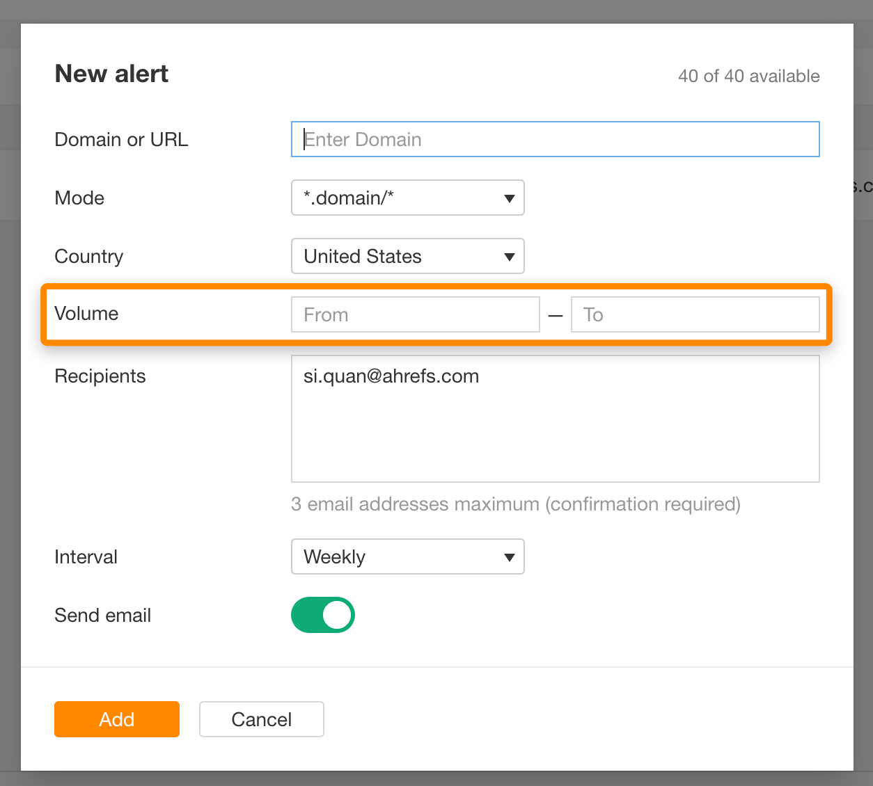 You can now choose your desired search volume range when setting up keyword alerts. No more notifications about keywords you aren’t interested in.