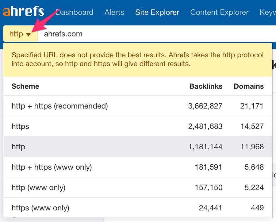 This little dropdown shows you all possible combinations and shows how many backlinks are pointing at each of them.