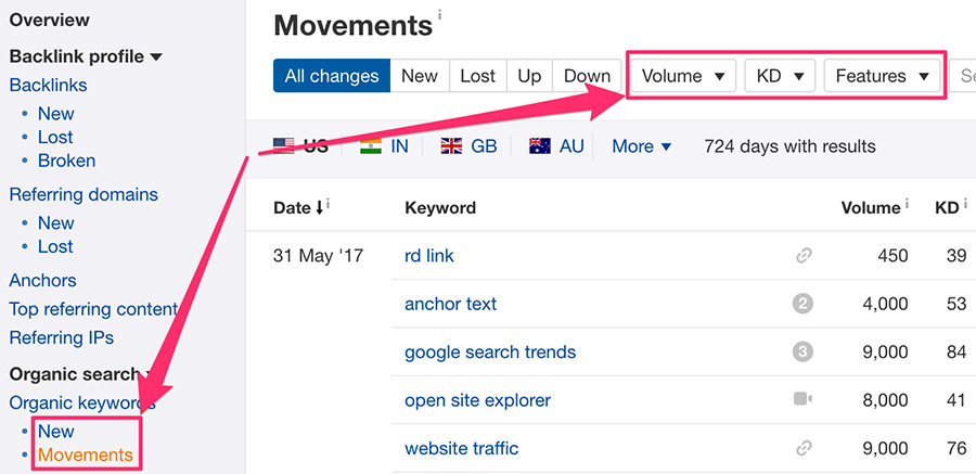The “New” and “Movements” reports, which are indented under “Organic keywords”, now have 3 much awaited filtering options: