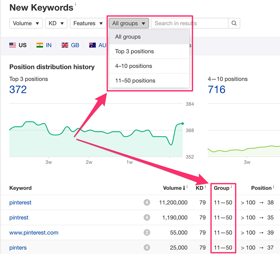 These same graphs can also be seen in “Organic Keywords” > “New” report, where you can actually filter out the new keywords in each group: