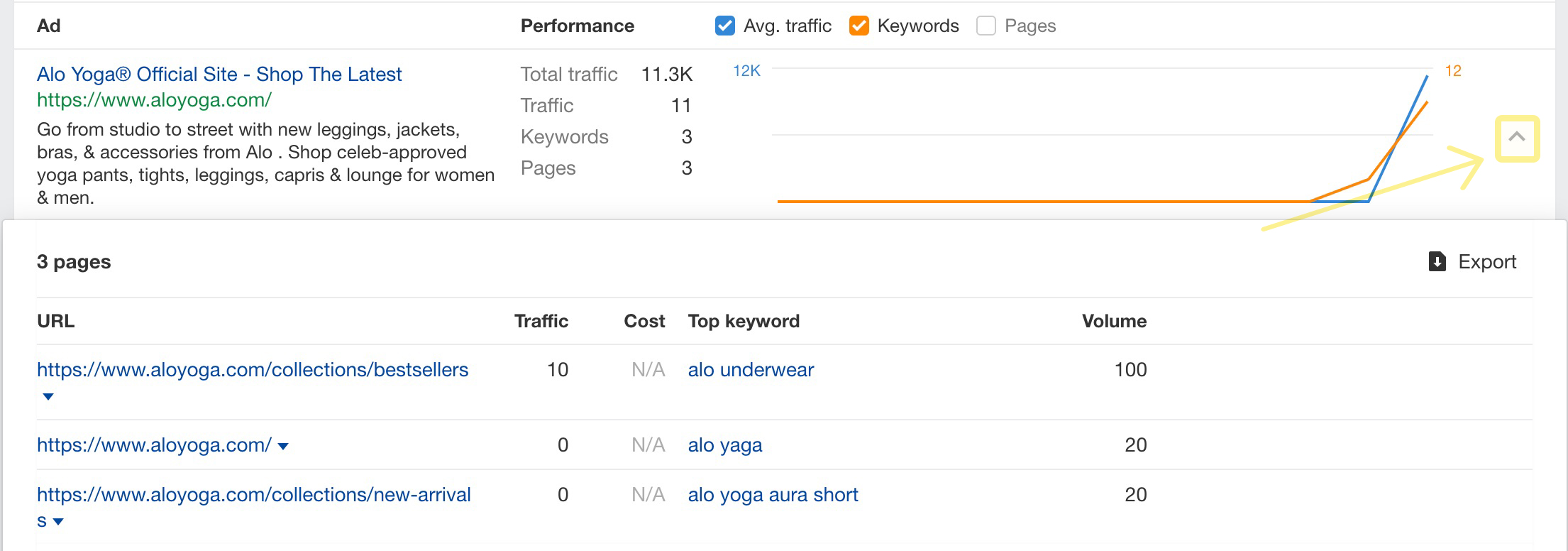 Click on this caret to open a nested table that shows you an ad’s keywords and destination URLs.