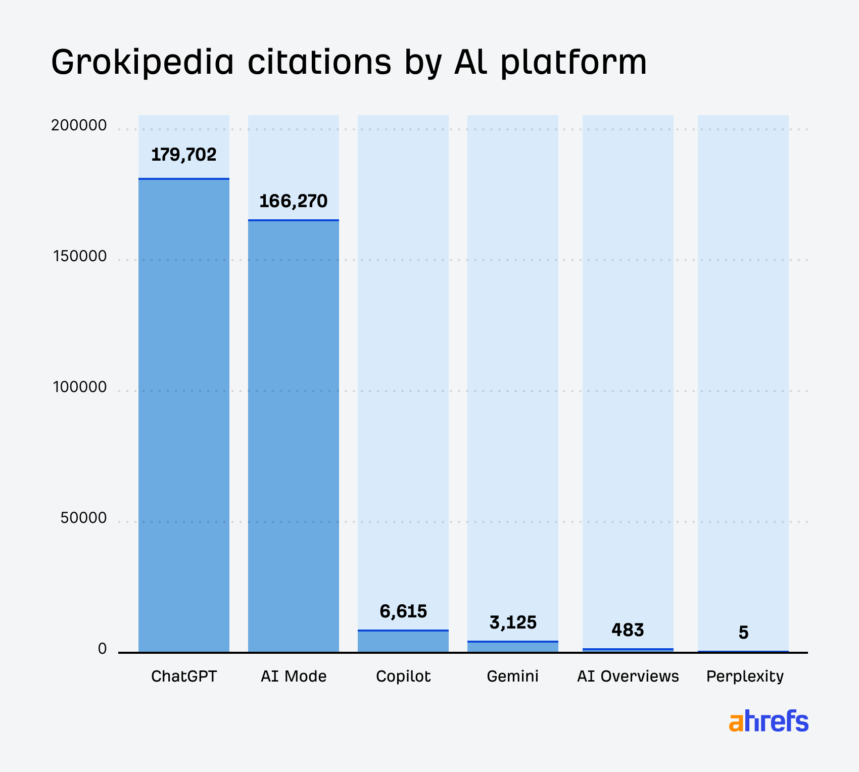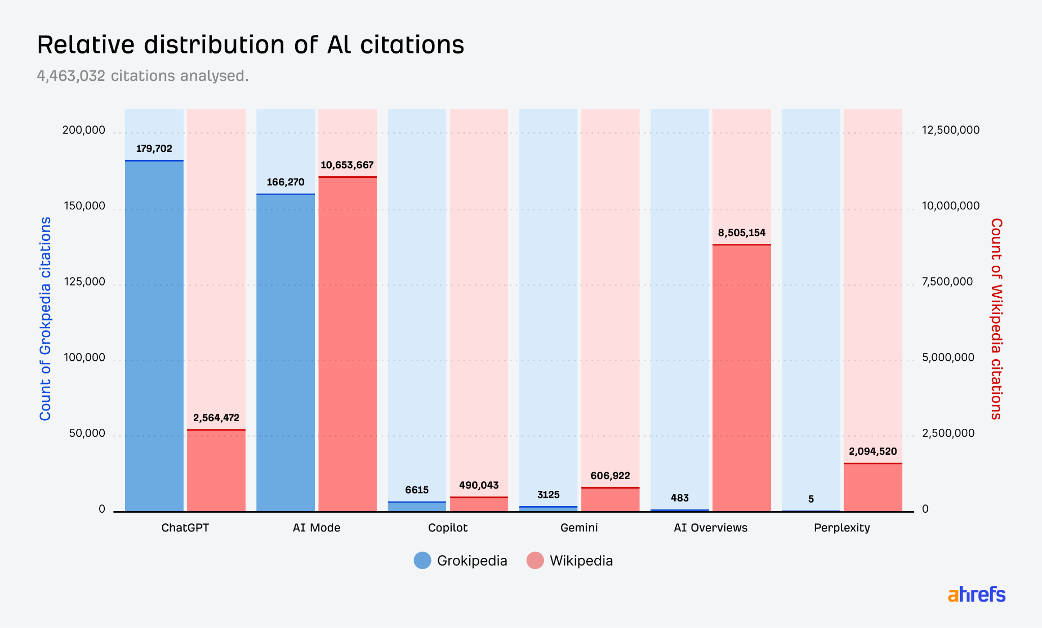 Grokipedia has earned the most citations from ChatGPT and Google’s AI Mode, with Copilot and Gemini a distant third and fourth: