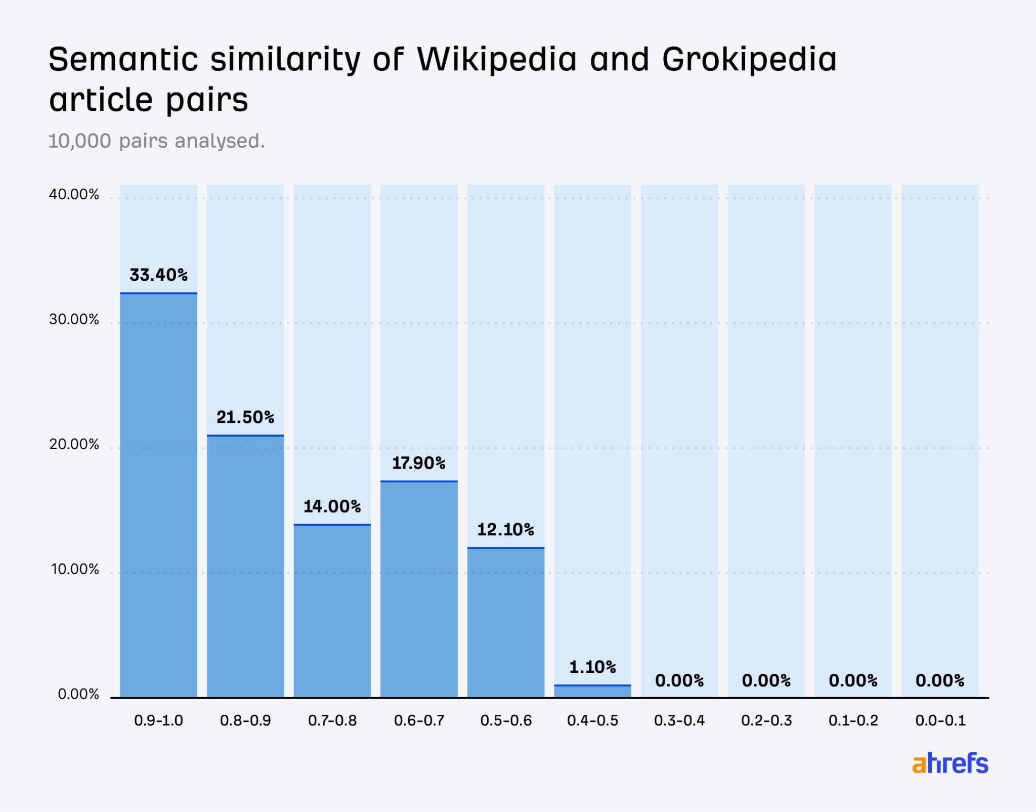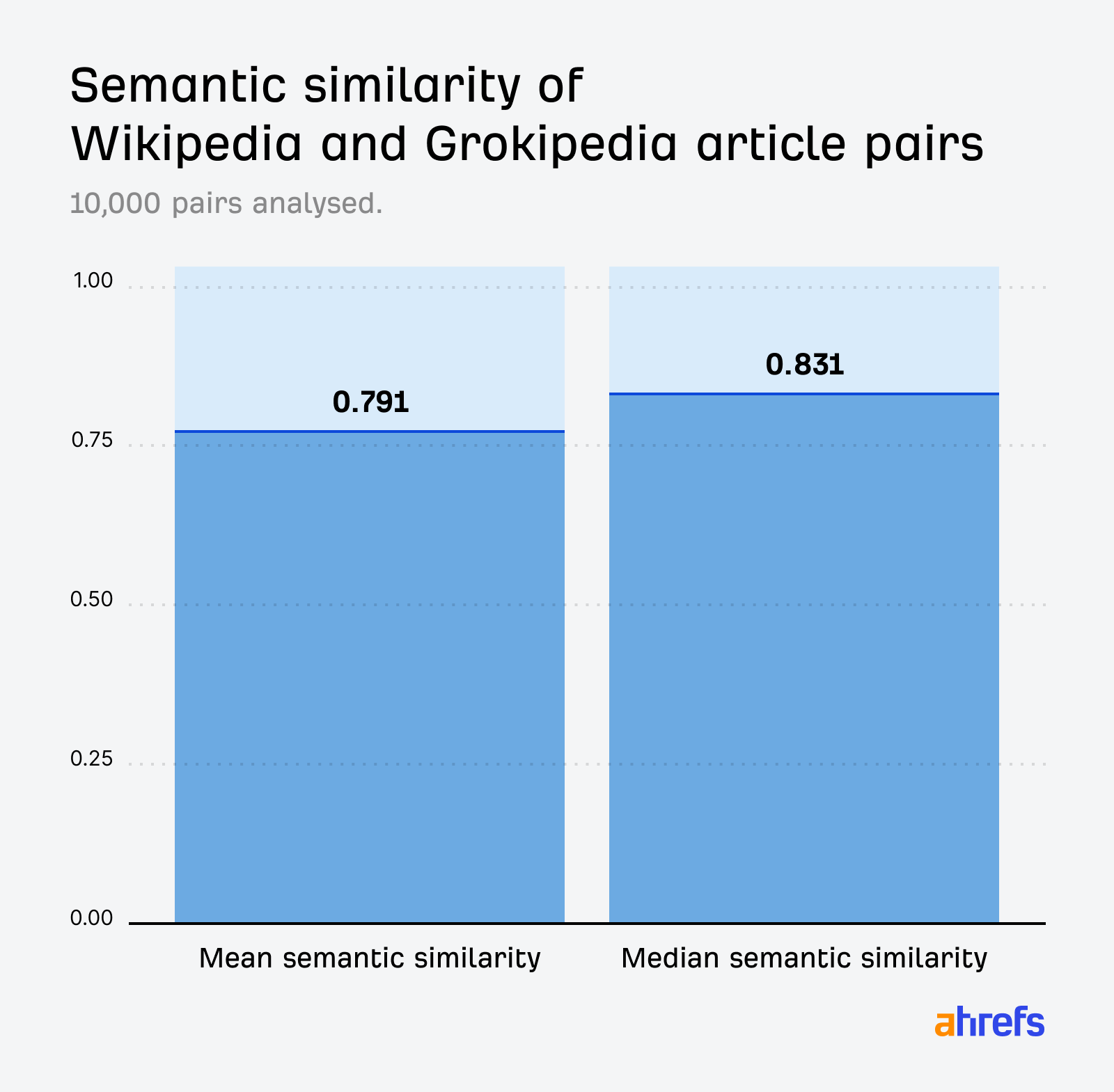 This is very strong semantic overlap. For context, if we take Grokipedia pages and compute their cosine similarity with random Wikipedia pages (that is, mismatched pairs), the mean cosine similarity is ~0.62.