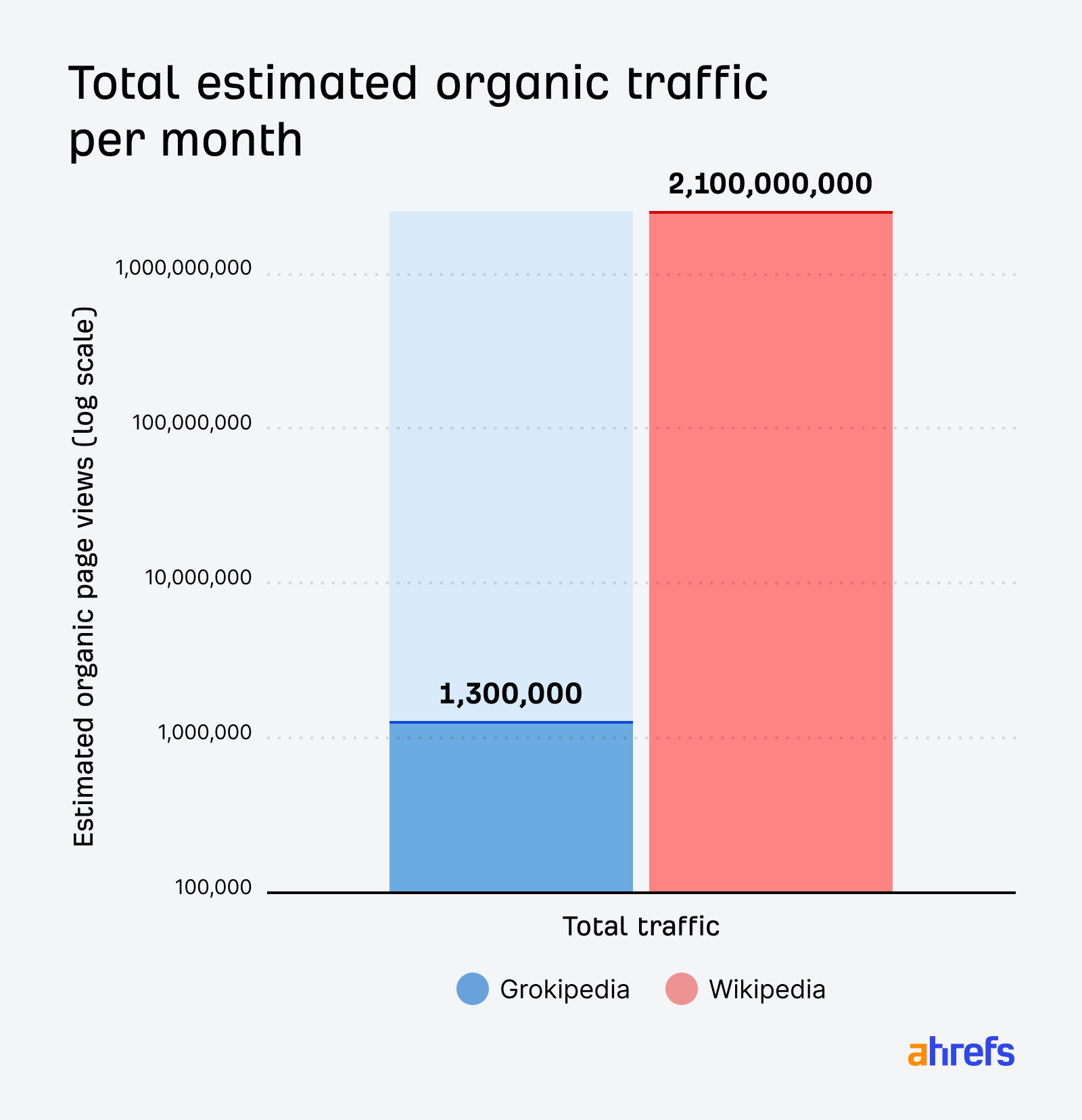 We estimate Wikipedia’s organic traffic at ~2,100,000,000 pageviews per month, compared to ~1,300,000 for Grok: a difference of 1,615x (requiring a log scale to plot on the same chart):