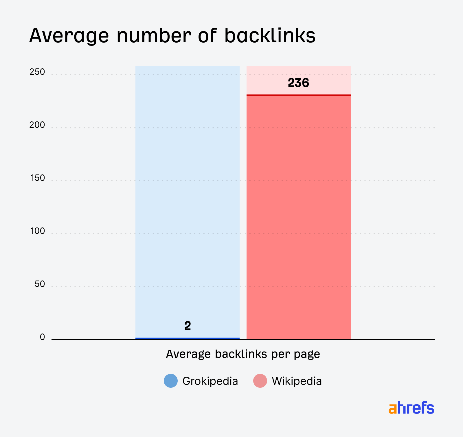 Wikipedia has 879,615,708 backlinks to Grokipedia’s (still very impressive) 1,414,654 backlinks, or 622x more. Dividing backlinks by total page count, Wikipedia has ~236 backlinks per page to Grokipedia’s ~2: