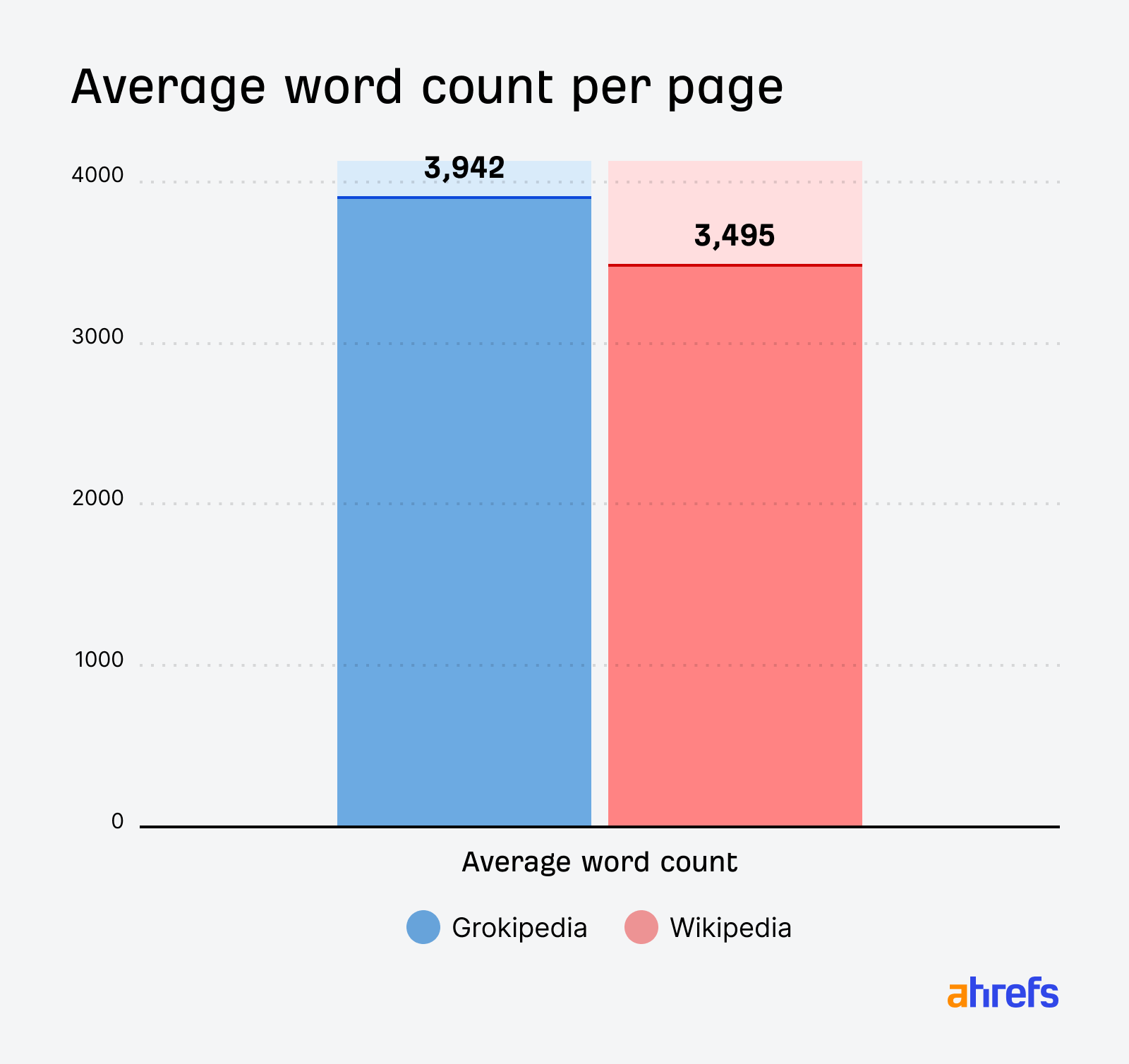 Grokipedia pages average 3,942 words compared with Wikipedia at 3,495, a difference of around 13%—slightly longer, but less of a difference than I expectedm given how “cheap” generative AI has made content creation: