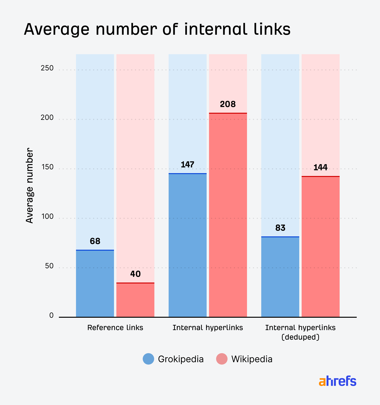 But Wikipedia, with over five times as many total pages, is much better at internal linking between related concepts, with an average of 144 unique internal links per page to Grokipedia’s 83:
