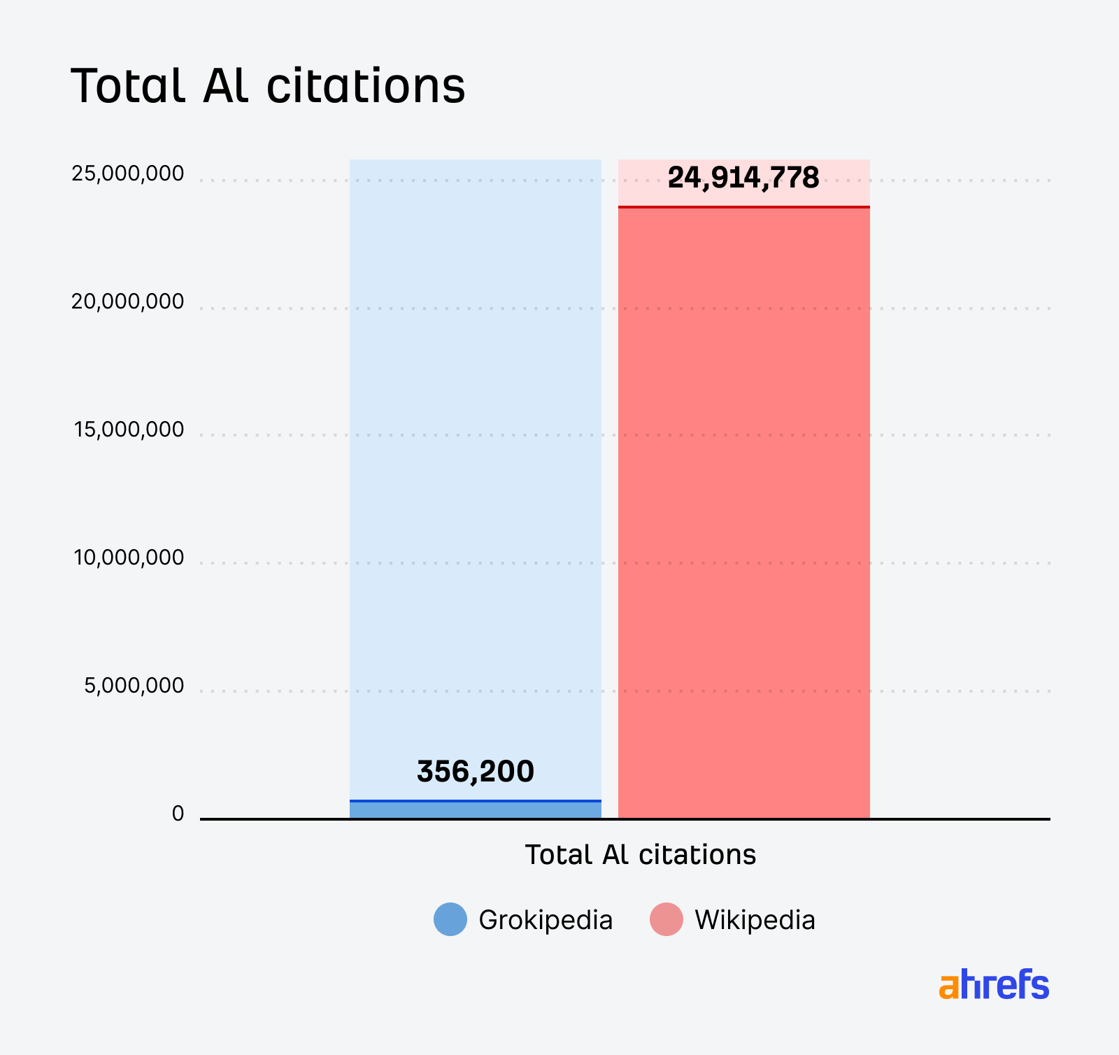 Despite having have 1,615x the total traffic of Grokipedia, Wikipedia has “just” 70x the number of AI citations: 356,200 for Grokipedia versus 24,914,778, or an average of 0.48 citations per page for Grokipedia, and 6.69 for Wikipedia: