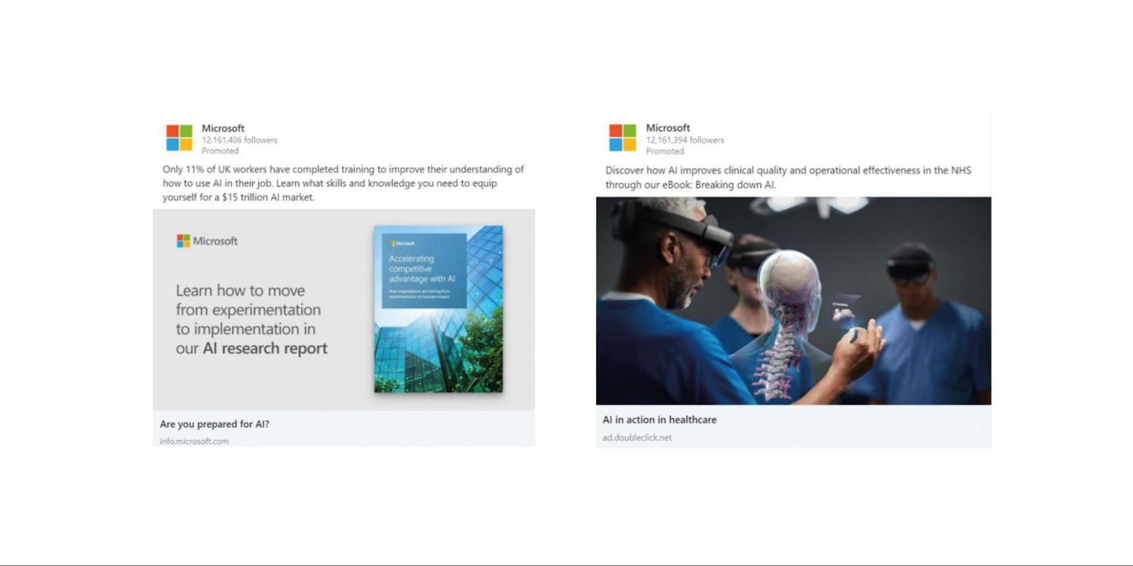微软将目标锁定在使用 LinkedIn 广告的2000个用户名单上,目的是提高人们对其创新服务的认识,并收集联系人(尤其是高级决策者)。该公司还希望增加其语音(SOV)在人工智能领域的份额。