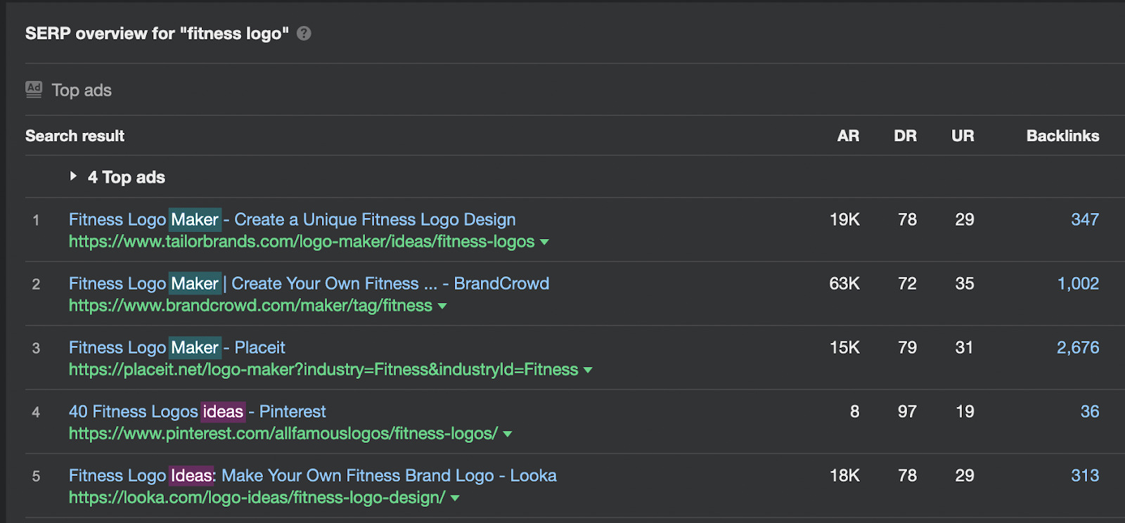 如果我们看看 SERP,我们会看到工具,让您设计自己的健身业务标志。如果 Canva 建立并优化了一个以“健身标志”为目标的登陆页面,它很可能会为这个关键词排名,并获得相当数量的额外收入。