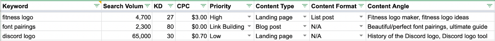 既然你已经知道要针对哪些关键词,那么让我们制作一个电子表格来帮助你计划和执行你的 SEO 策略。您可以使用这个 电子表格模板。
