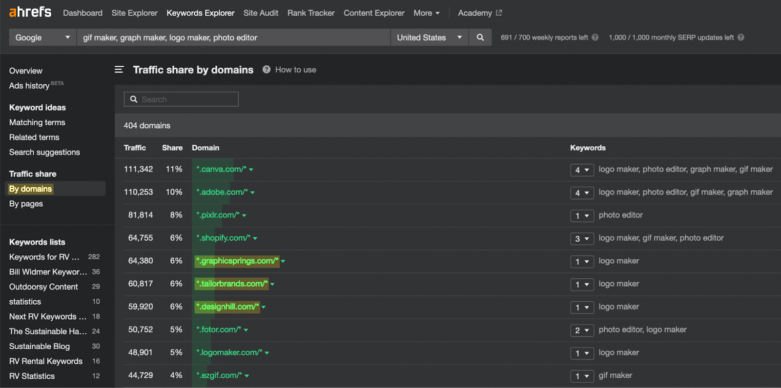 一旦你想出了5到10个种子关键词列表,把这些关键词输入到 Ahrefs 的关键词分析中。然后点击 Traffic share 下的“ By domains”选项卡。这就是你如何找到你的搜索竞争对手。