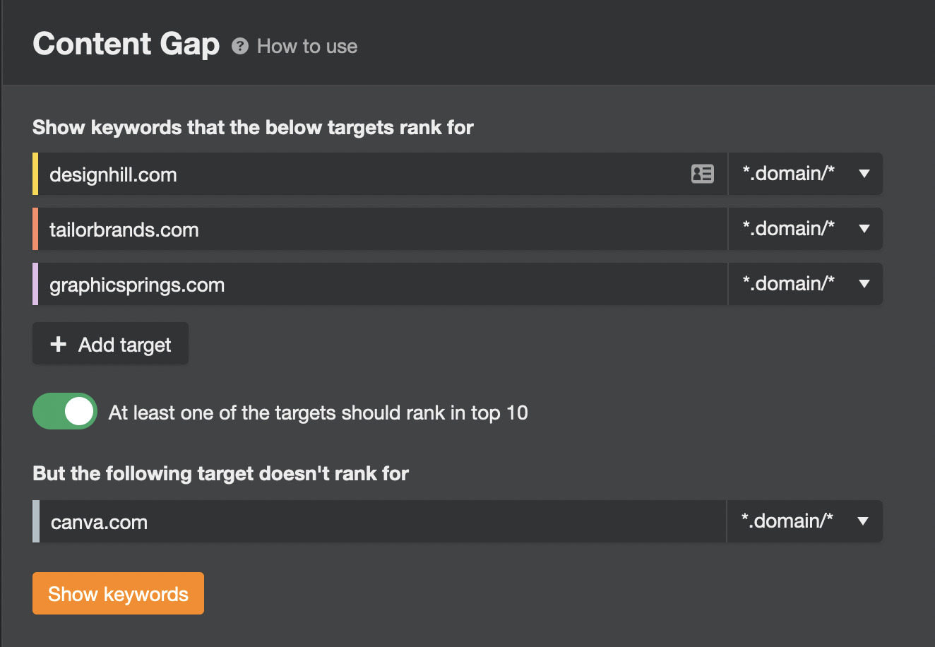 接下来,浏览 Ahrefs 的 内容差距机会工具 中的所有关键词,并试着为你的三个列表中的每一个列出至少5到10个关键词。