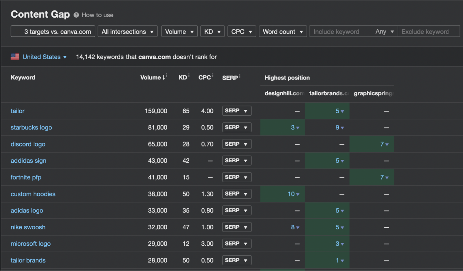 看起来 Design Hill,Graphic Springs 和 Tailor Brands 都是 Canva 潜在的搜索竞争对手。