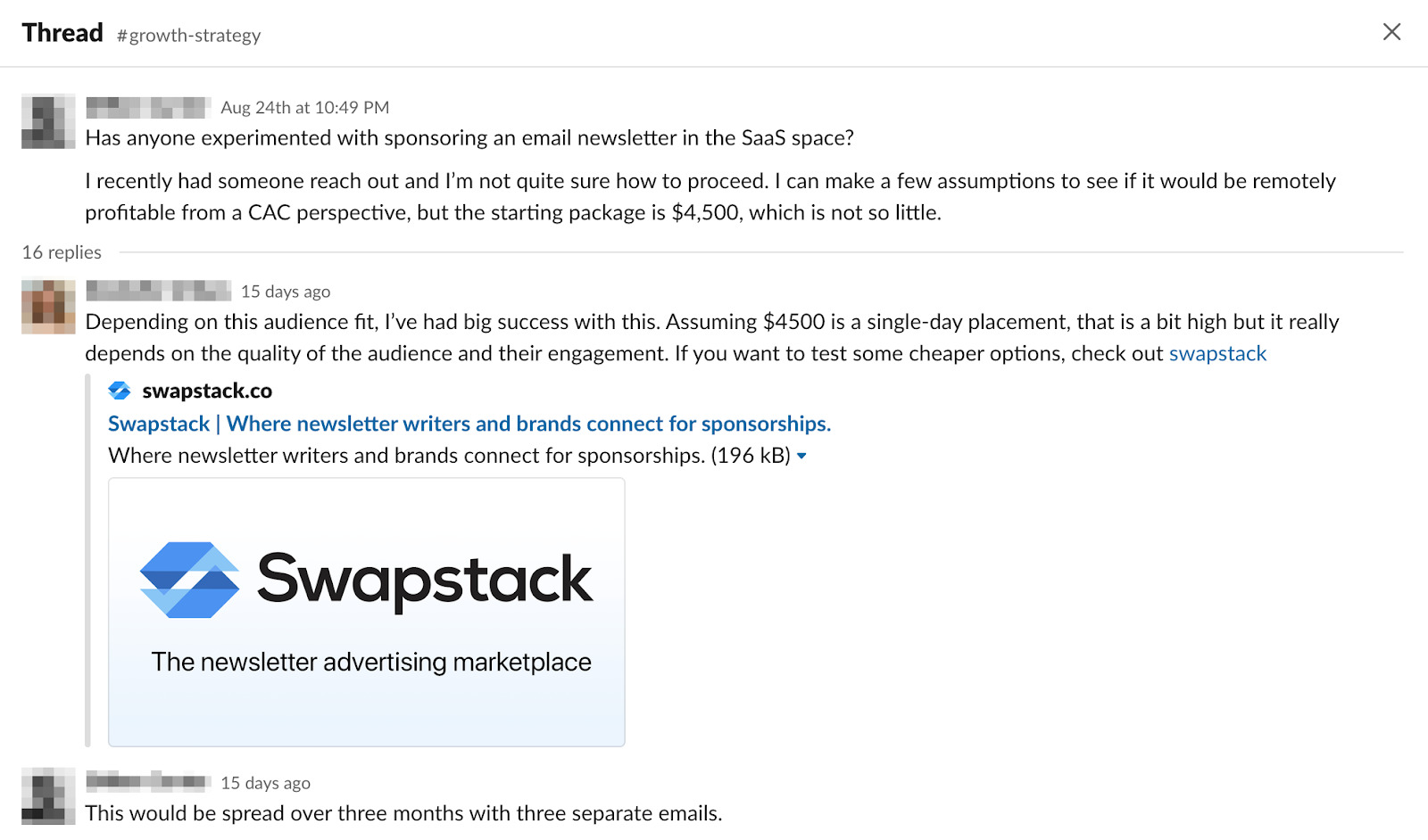 社区内有17个频道,深入探讨诸如“分析与数据”、“b2b”、“产品与营销”和“fb-ig-ads”等主题。组织良好的空间使搜索信息或从合适的人那里获得帮助变得更加容易,虽然讨论可以获得相当的技术性,但回应往往是及时和有见地的。例如,您可能会在#ecom和影响者》中找到关于影响者营销策略的问题,并在#增长战略中找到关于电子邮件时事通讯赞助的讨论。
