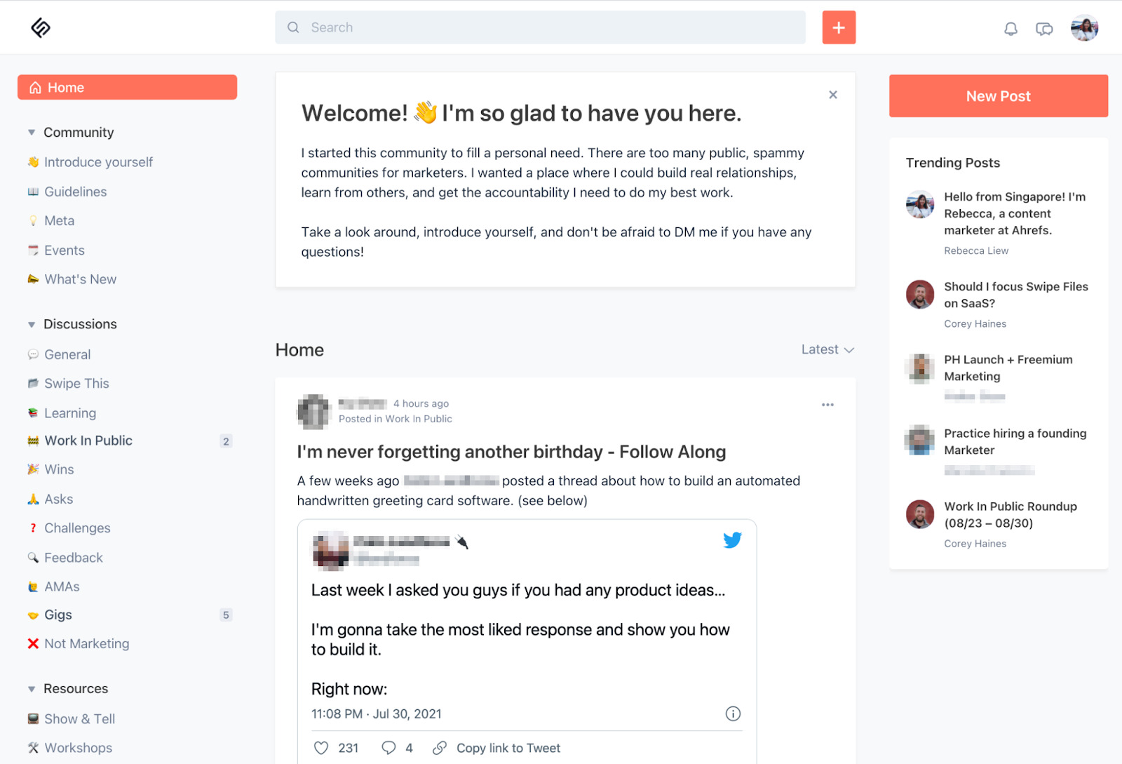 You know you’ve landed on something good when a marketing community has members from well-known tech companies, including Shopify, Udemy, Intercom, and HubSpot.