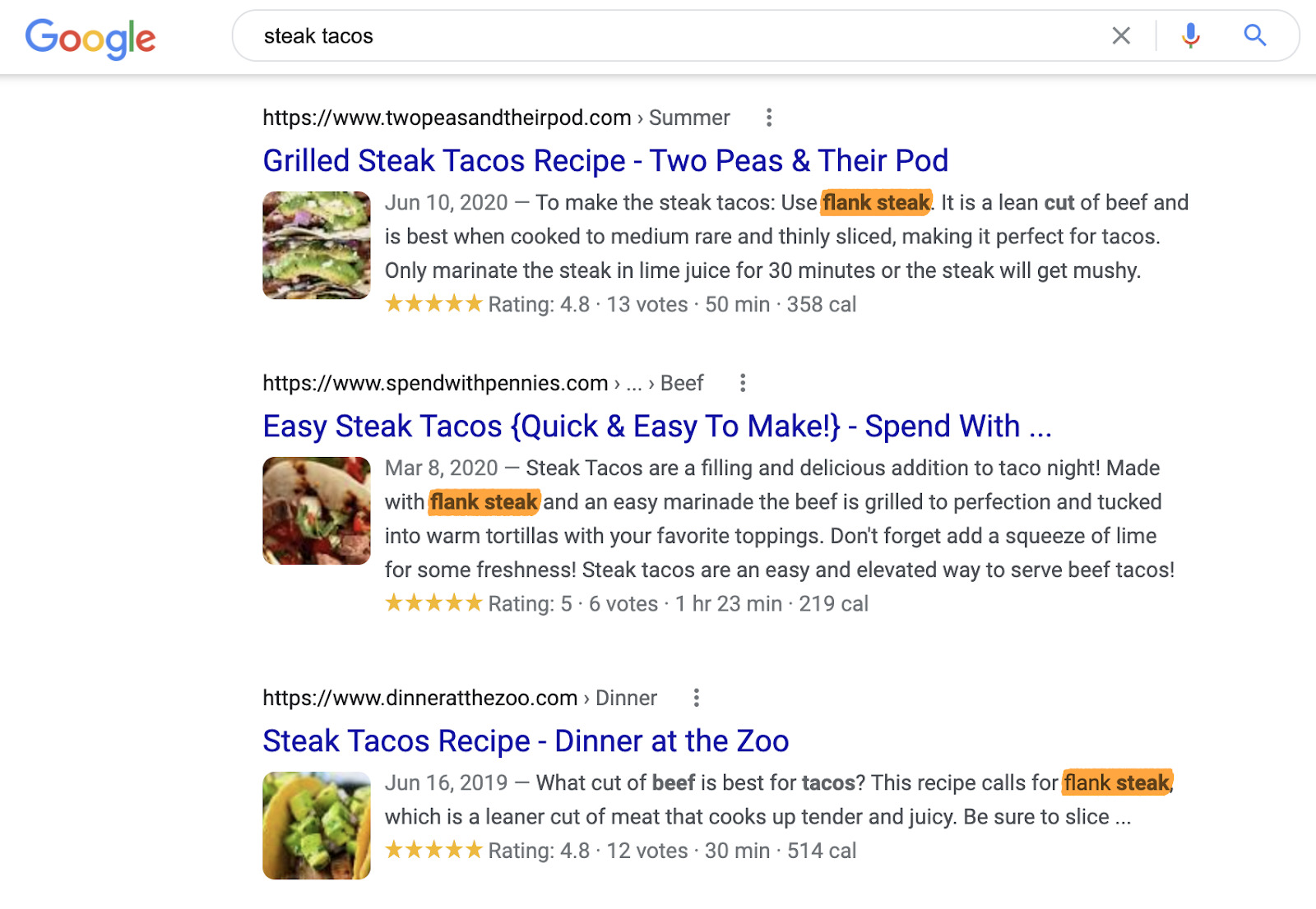 例如,“steak tacos” 的所有结果都讨论了最适的牛排,谷歌甚至用粗体显示了 “flank steak” 和 “beef” 等术语。所以这些可能是你需要在元描述中提及的内容。
