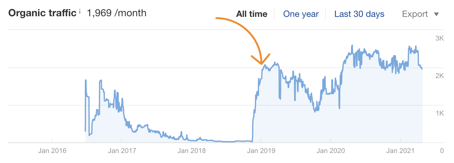 例如,我们在 2016 年发布了一项页面 SEO 研究,但它从来没有排名特别高,或获得很多自然流量,因为其实用户并不想要一项研究。因此,在 2018 年,我们重写了这篇文章作为指南,并在同一 URL 下重新发布。