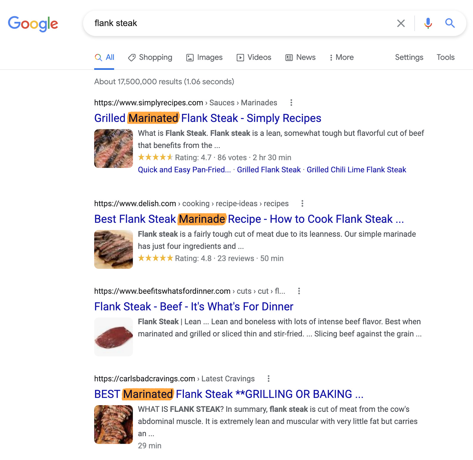 例如,搜索 “flank steak” 的人显然想要一个包含腌料的食谱。如果你想排名,你需要给用户提供它们想要的东西,而不仅仅是告诉他们用盐和胡椒调味然后把它扔进锅里。