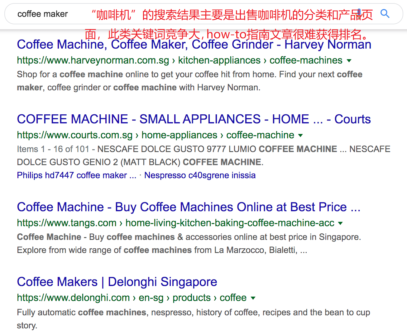 看起来大多数排名靠前的页面都是出售各类型咖啡机的分类页面。在此情况下,无论你的内容多优秀,你都很难通过博客帖子或文章获得排名。