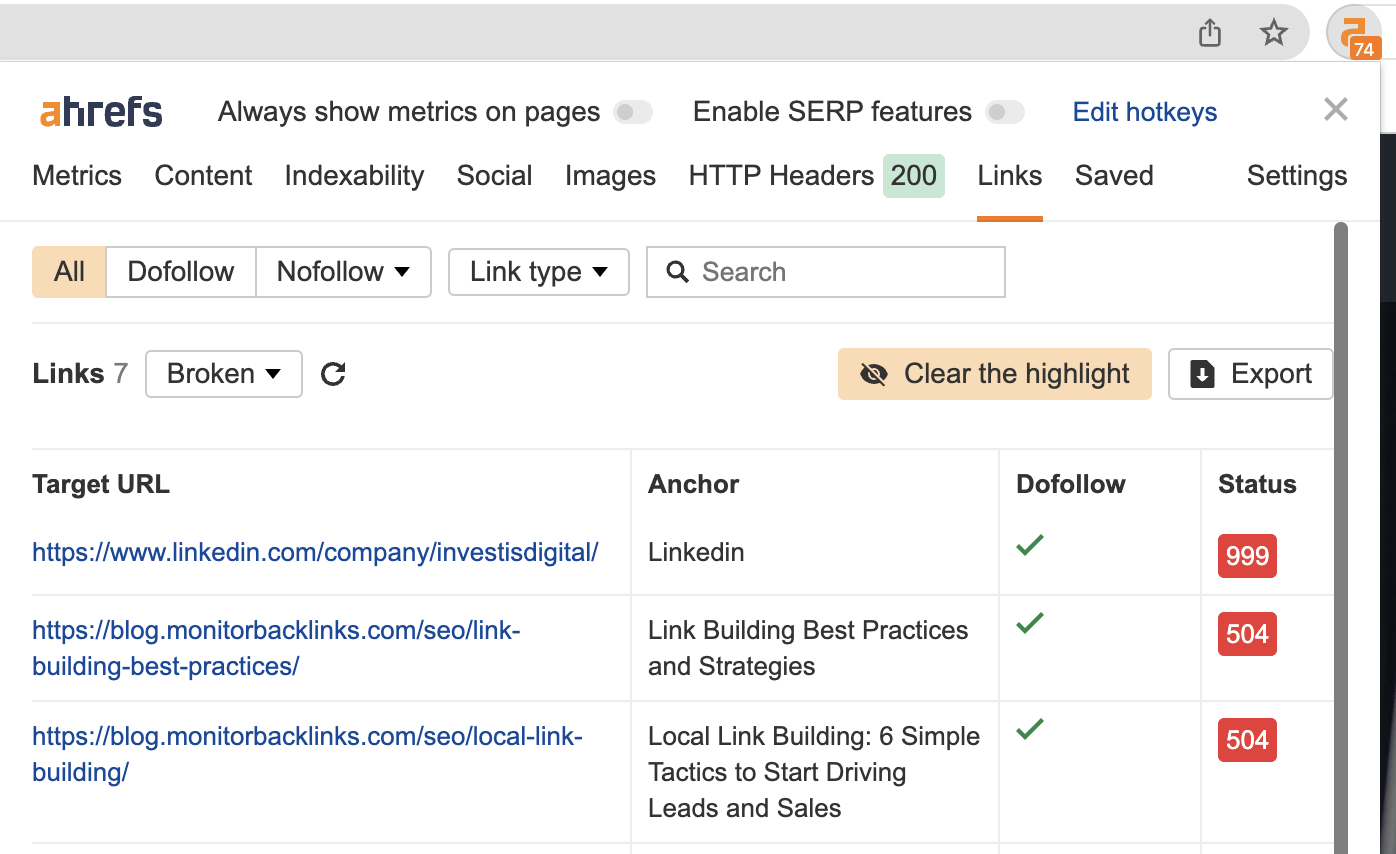 然后需要检查这些页面上的失效链接,可以使用 Ahrefs 的 SEO 工具栏免费执行此操作。
