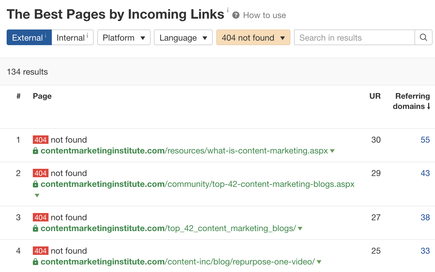 举例来说,Content Marketing Institute 的网站上有 134 个失效页面,其中一些有来自 50 多个引用域的反向链接。