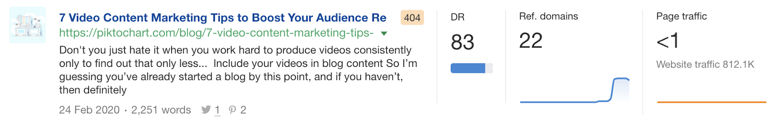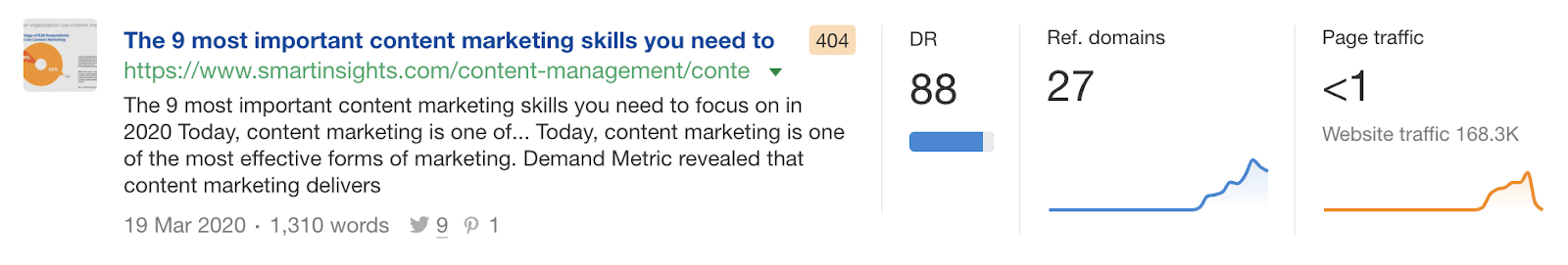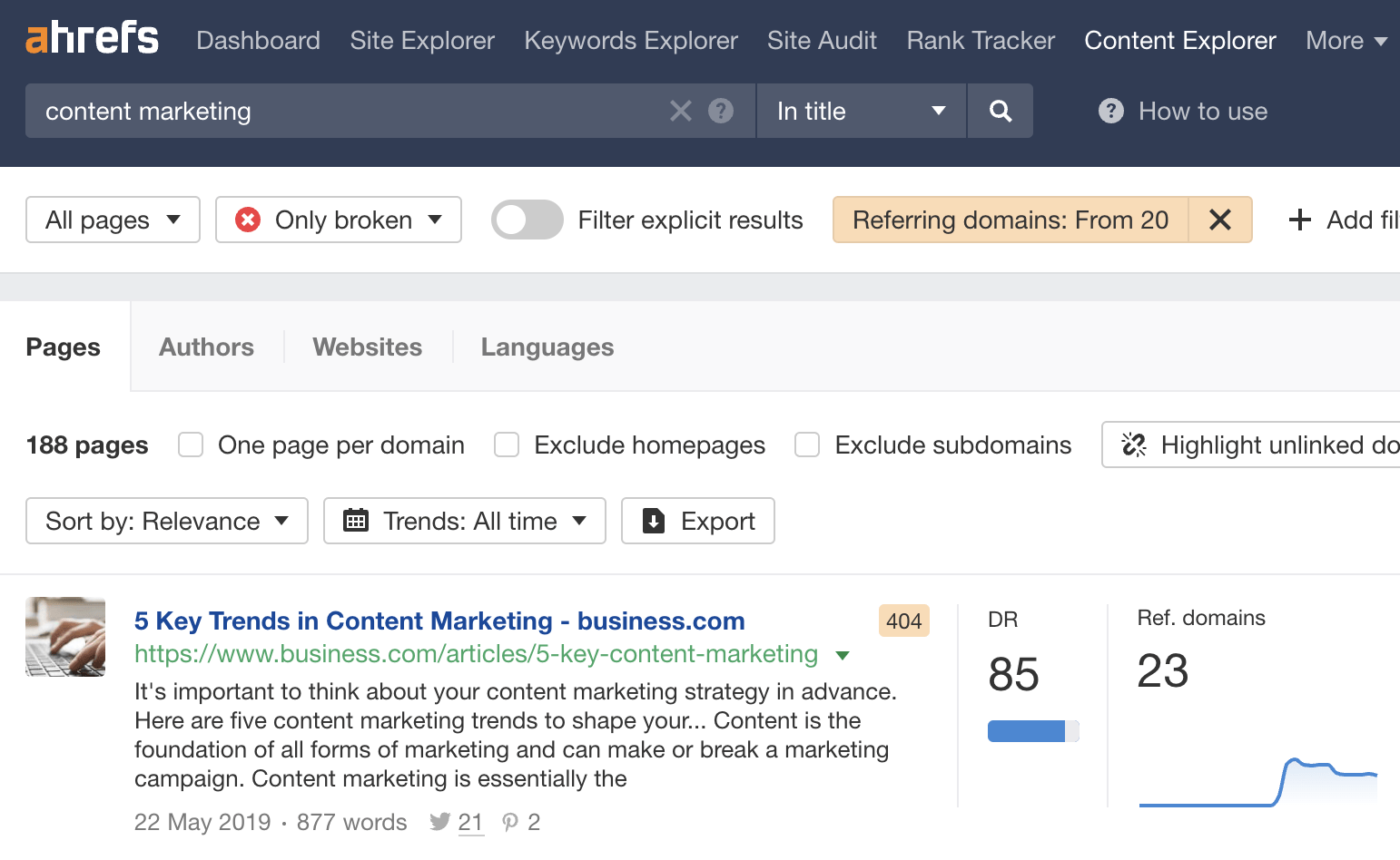 在下面的示例中,有 188 个失效的页面,其中至少有 20 个关于内容营销的反向链接: