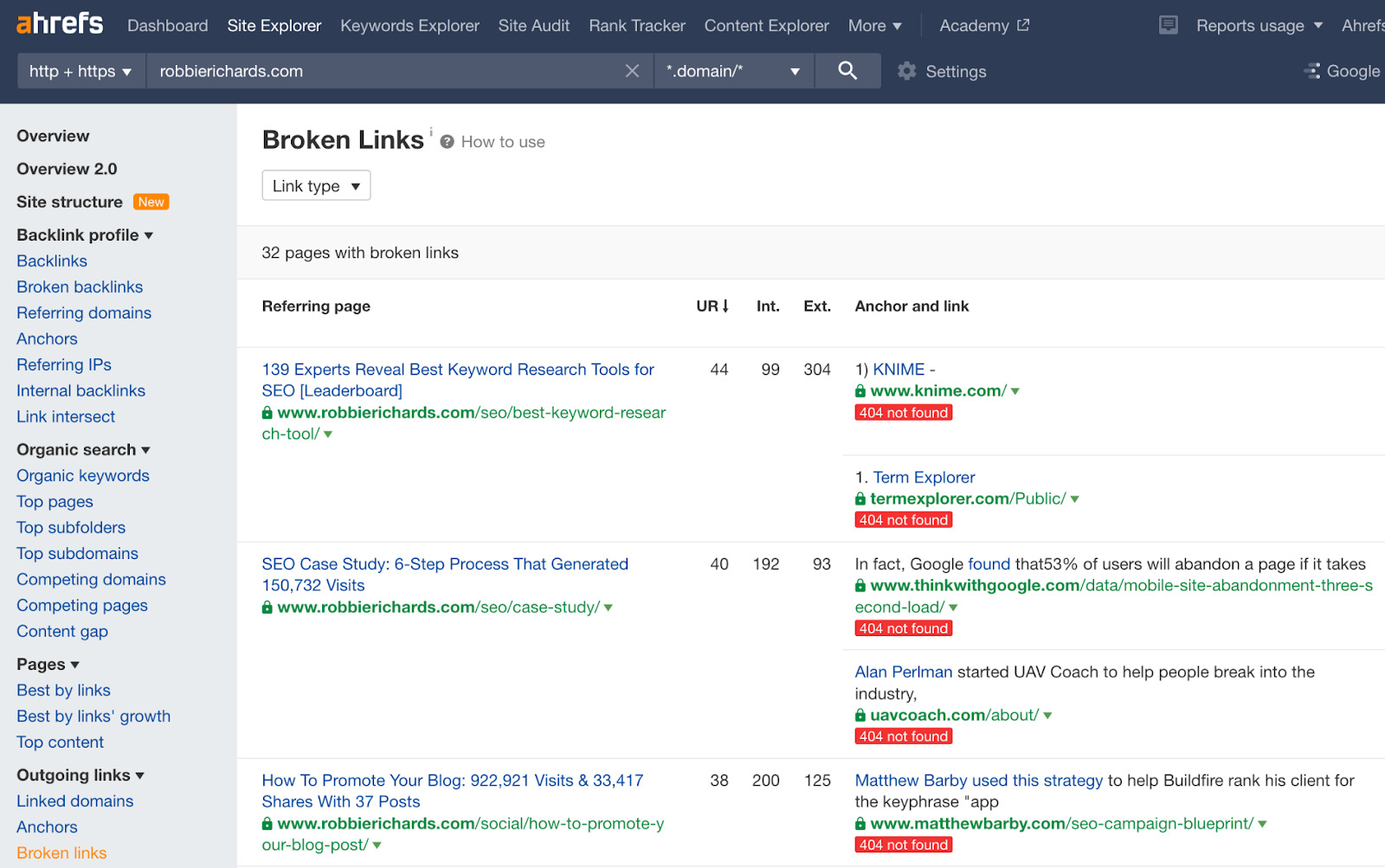 举例来说,robbierichards.com 链接到 32 个失效页面:
