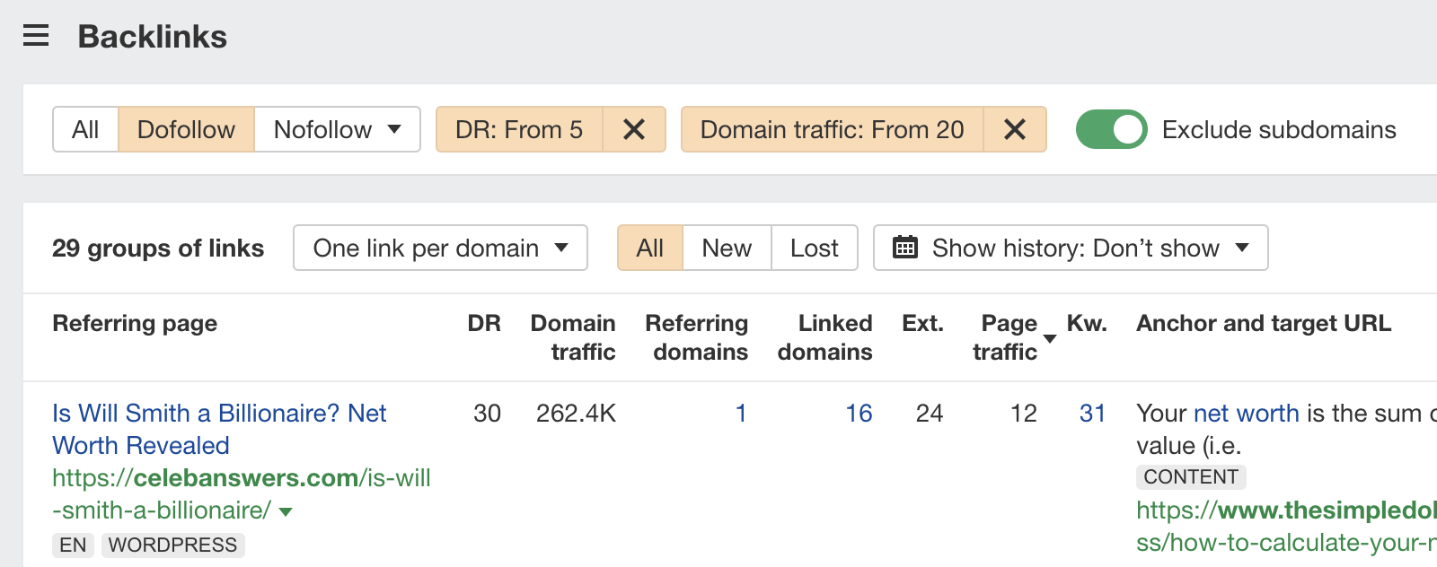 - 域流量:20+。这不包括来自流量很少或没有流量的网站的链接。