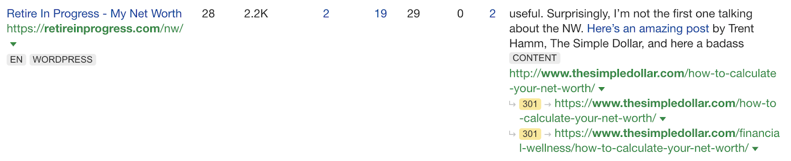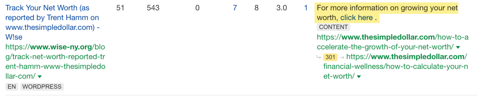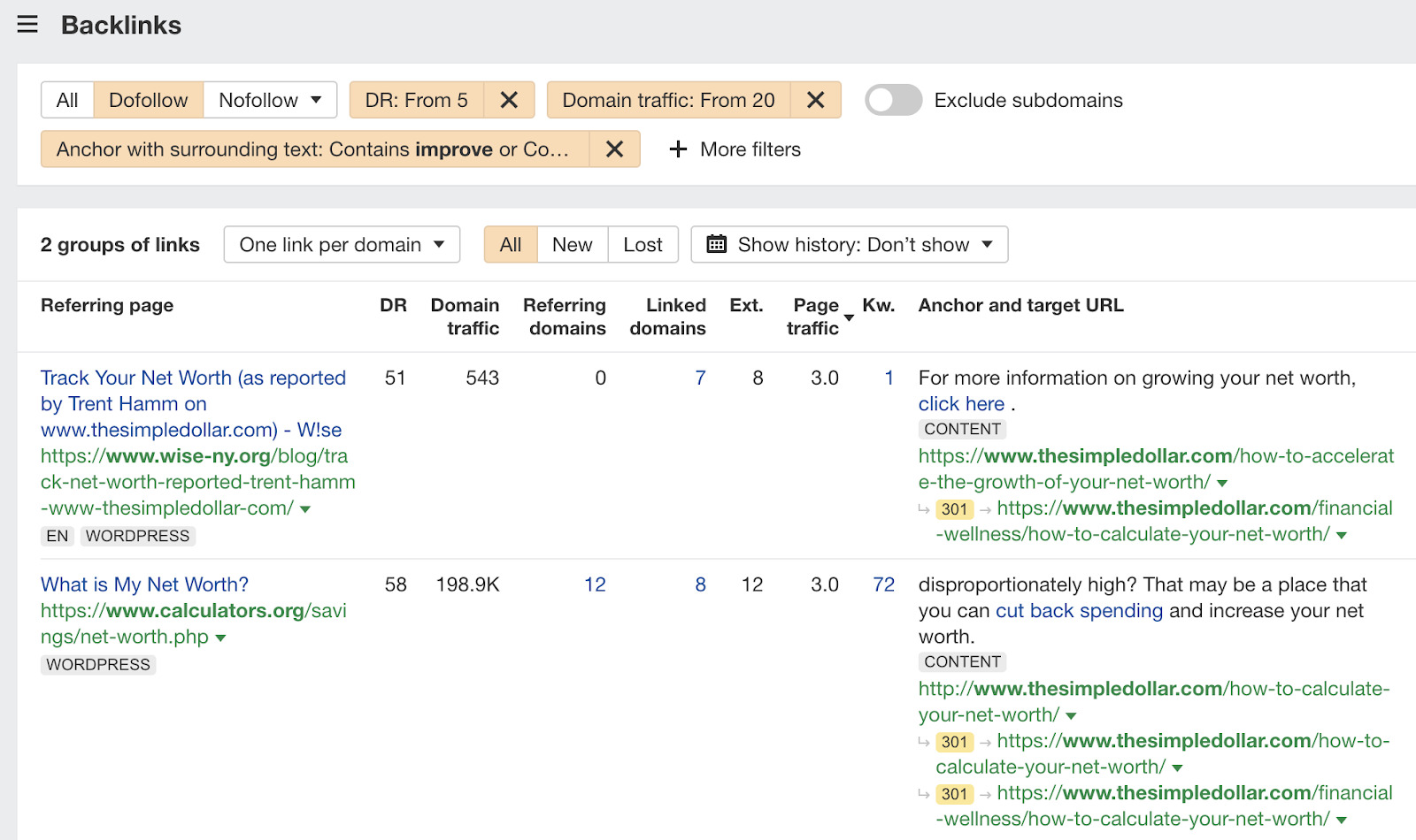 识别深层链接可帮助你创建引人注目的替换页面,因此请记下它们以及出于相同原因链接的人数。透过在外链报告中搜索锚文本或周围文本中的相关“足迹”找到它。