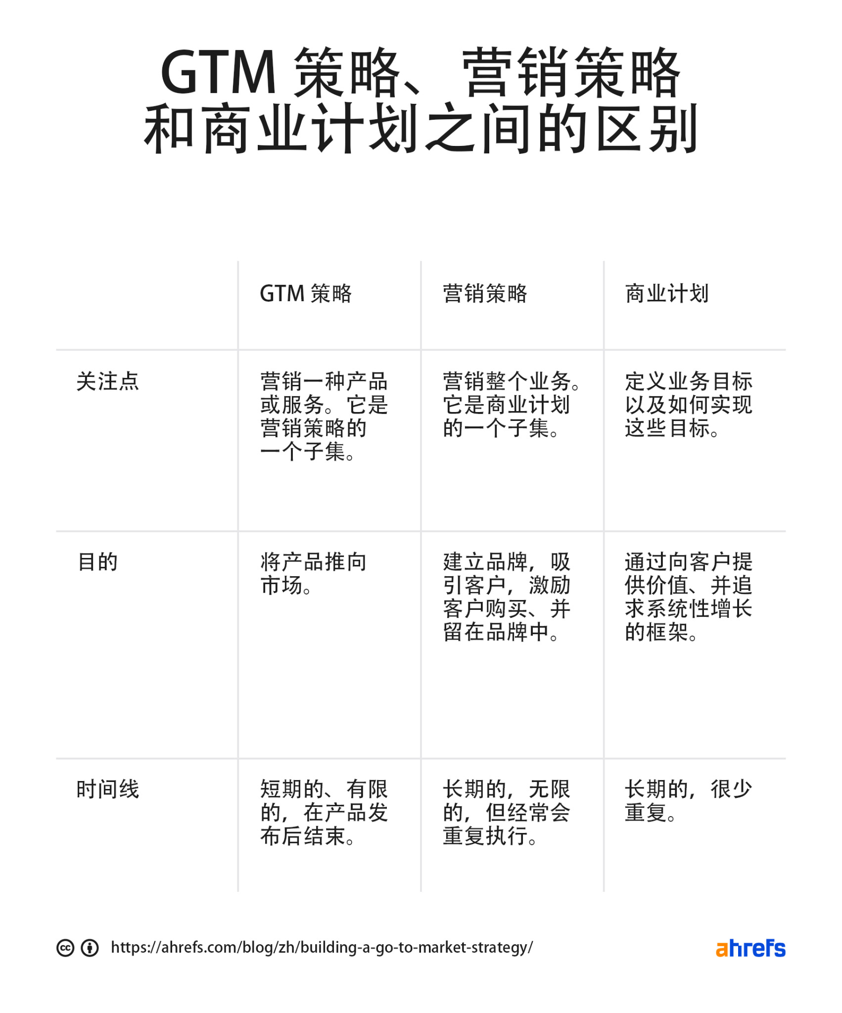 尽管这些术语并不相同,但它们经常可以互换使用。以下产品上市策略、营销策略、和商业计划的对比: