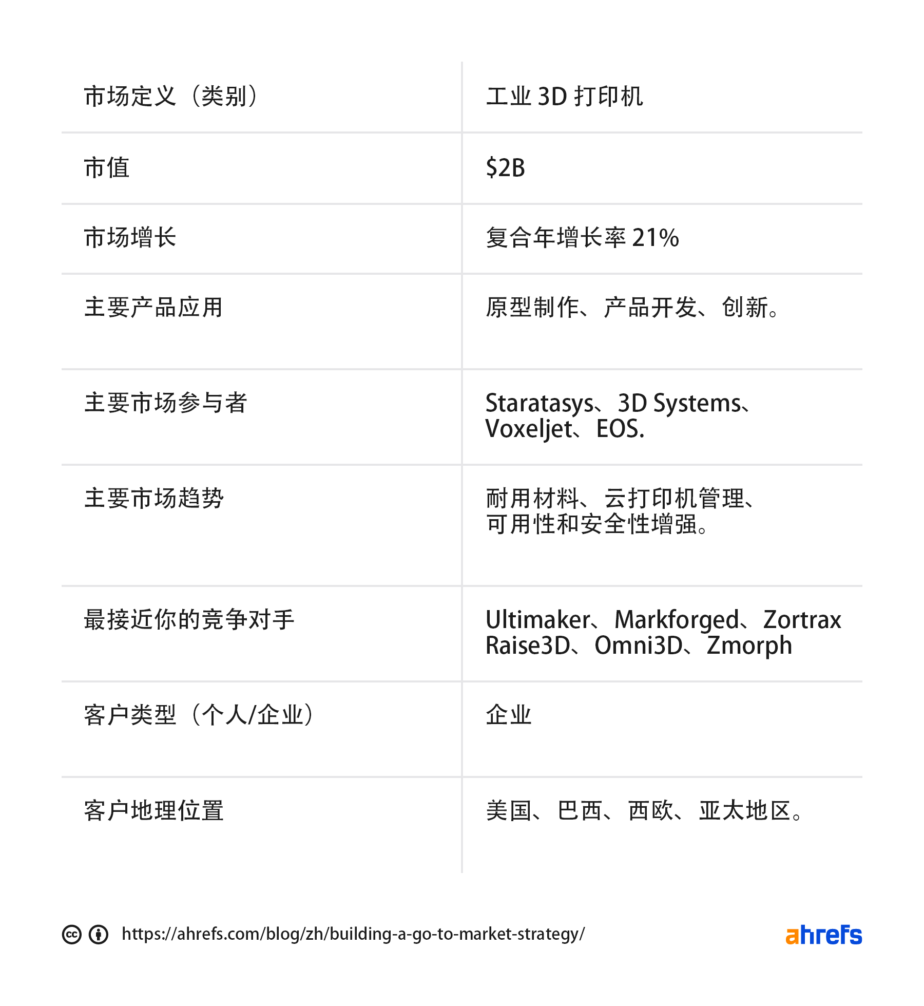 要将市场研究的发现联系在一起,请考虑下表。我们已经用 3D 打印行业的假设数据填充了。如果你可以根据你的研究填写它,那么你就可以进行 GTM 流程的下一步。