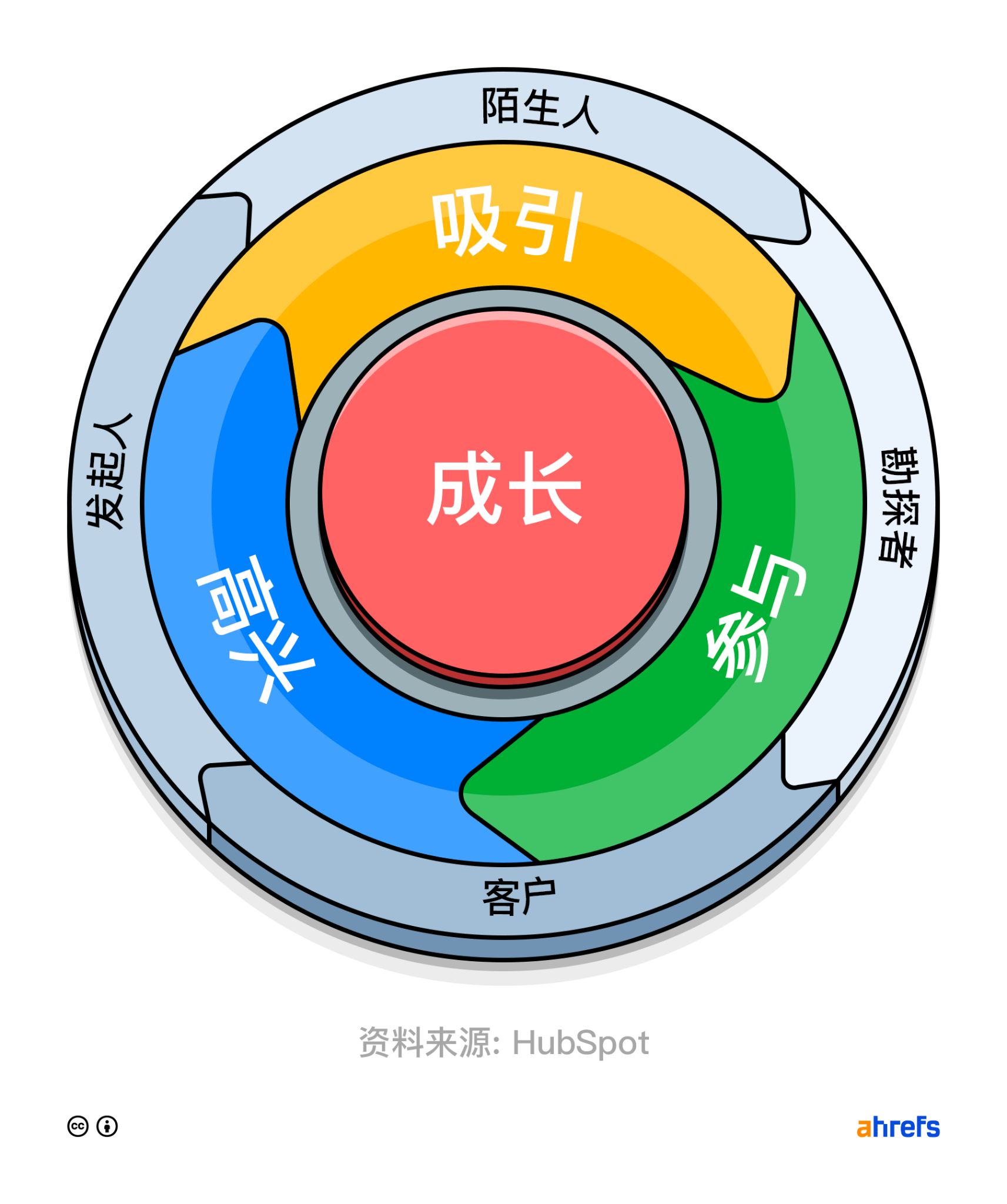 例如,你可以将成功指标建立在飞轮模型上。 在此模型中,你衡量客户旅程的三个主要阶段:吸引、参与、取悦。 增长是针对这三个指标进行优化的 “副产品”。 这就是 Hubspot 如何发展他们的公司(在抛弃旧的漏斗模型之后)以及 Jeff Bezos 如何为亚马逊设计增长战略。
