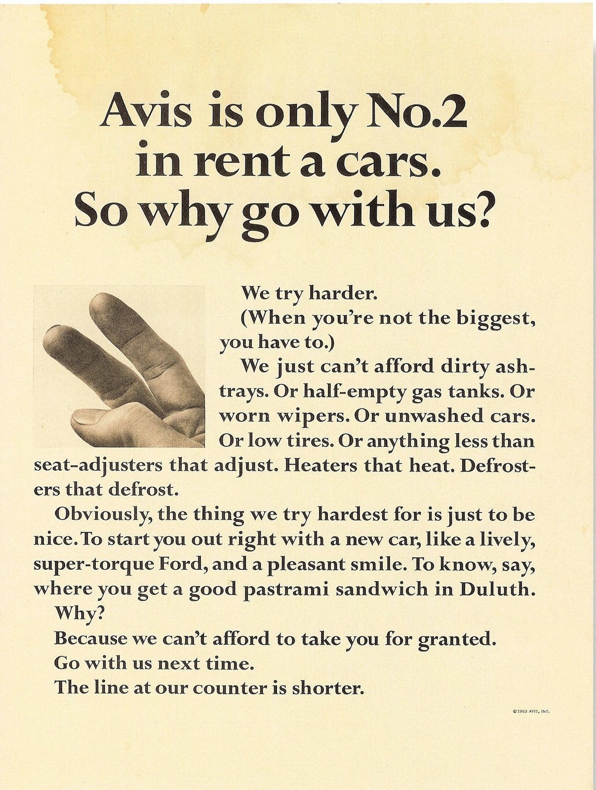在发布此广告时,Avis 在汽车租赁业务中排名第二。 Avis 接受了这个的事实并直接用在了广告的脚本中。