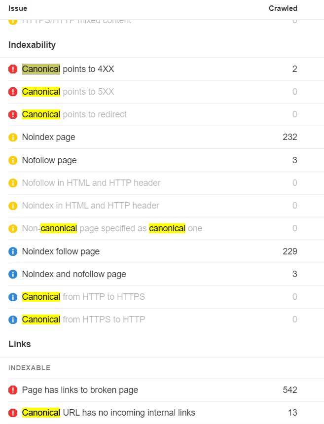 在 Ahrefs Site Audit(网站诊断)的网站审计中,我们显示了许多与规范化有关的问题。请记住,在大多数情况下,我们标记的是最佳做法。因为 canonical 标签只是一个提示,谷歌和其他搜索引擎将不得不选择一个页面的某个版本来索引。