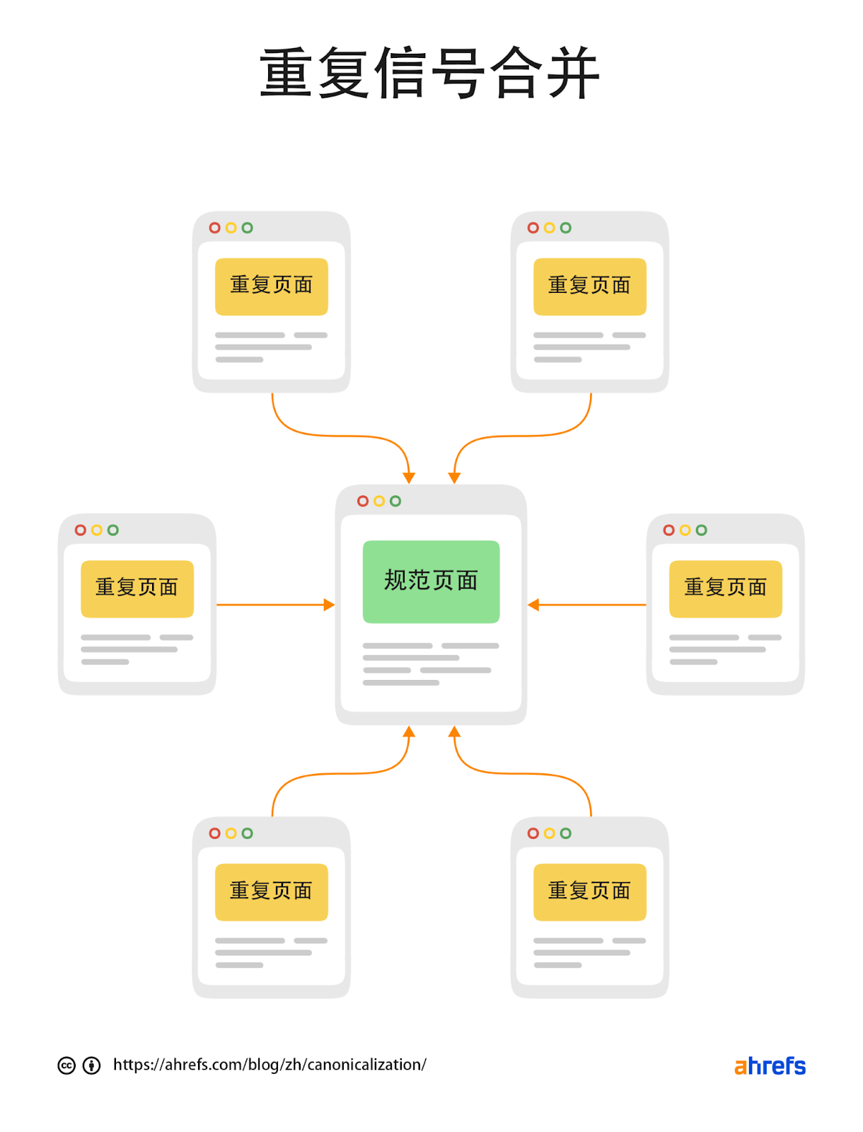 对于重复的内容,谷歌将挑选一个规范的版本进行索引。所有符合条件的页面形成一个页面集群,进入该集群中的页面的信号将合并到所选择的规范版本。该规范化指定的页面可能随着时间的推移而改变。
