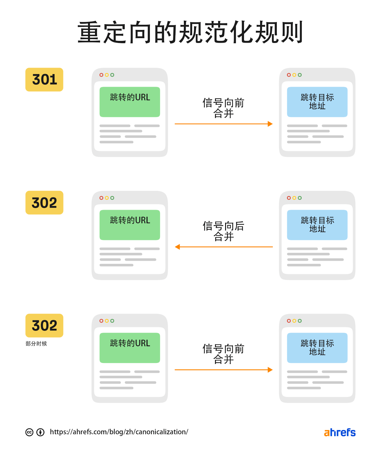 有几种不同类型的重定向,它们都是规范化的信号。它们会传递 PageRank,并帮助决定哪个 URL 可以被显示在谷歌的索引中。