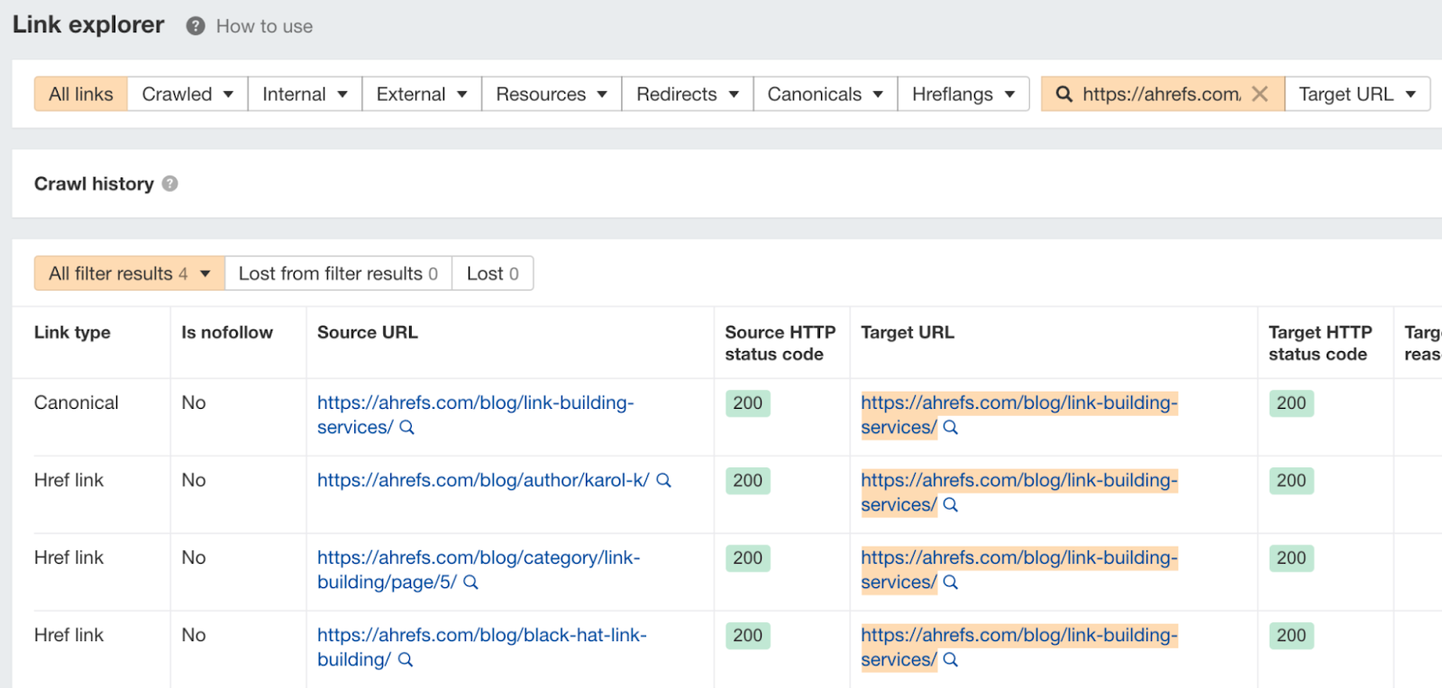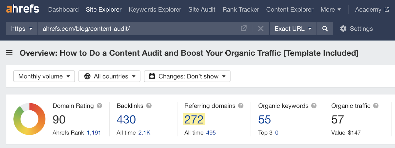 然后,你可以通过将其插入 Ahrefs Site Explorer(网站分析)来查看这些数字与你的页面数据的对比。