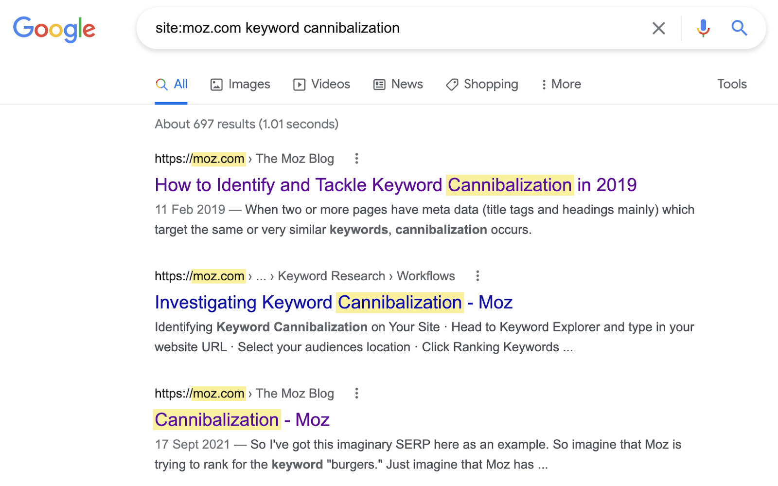 例如,如果我们运行一个网站:搜索 moz.com + keyword cannibalization,Moz 似乎有多个针对此关键词的页面: