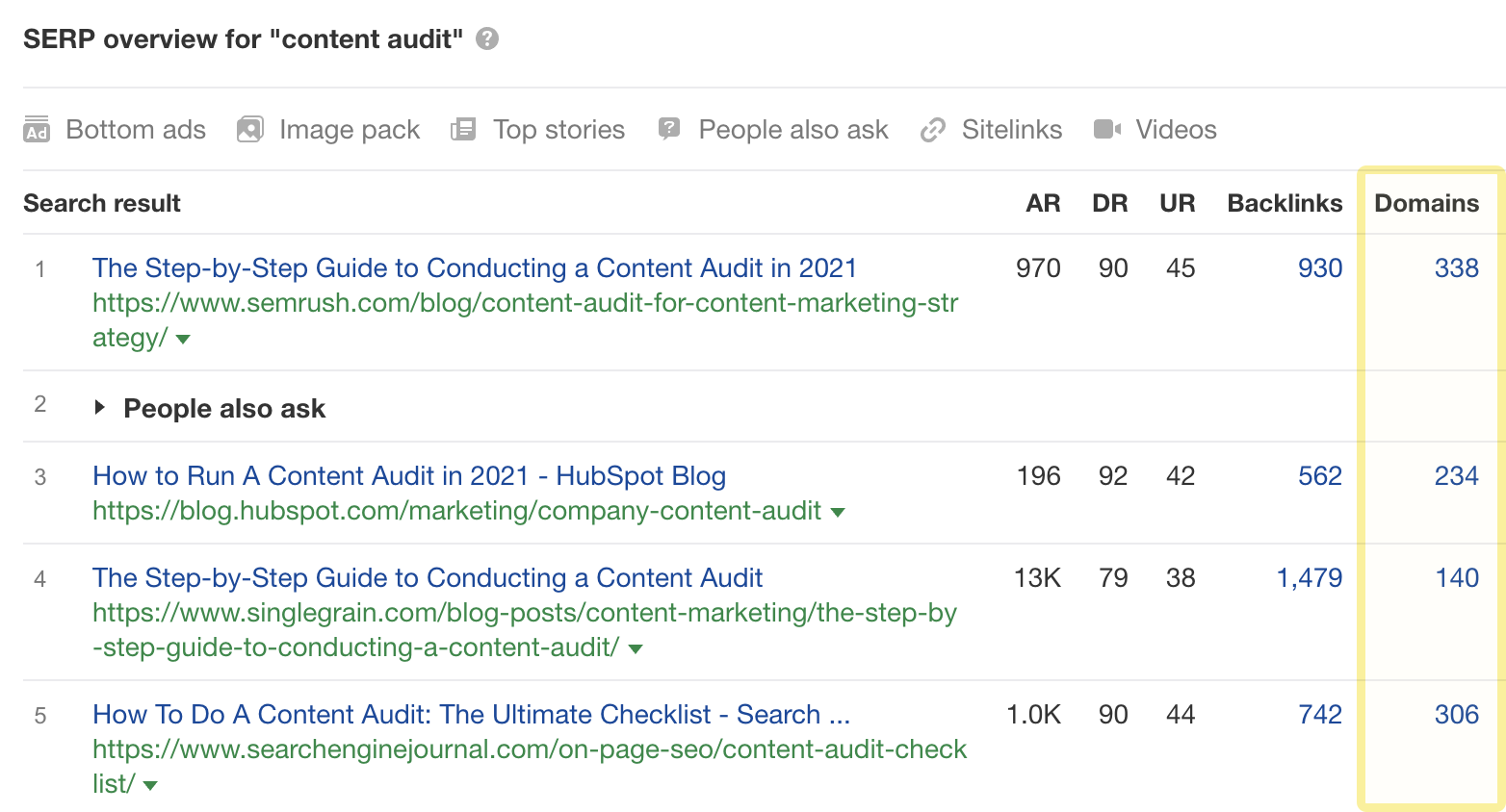 在我们的例子中,看起来我们并不缺少反向链接,因为指向我们页面的引用域的数量与我们的竞争对的手大致相当。