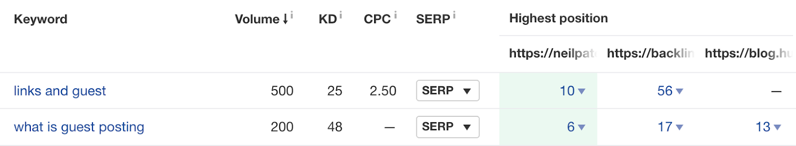 例如,如果我们为我们的访客博客指南执行此操作,你会看到一些排名靠前的页面正在参与 “what is guest blogging” 关键词的排名: