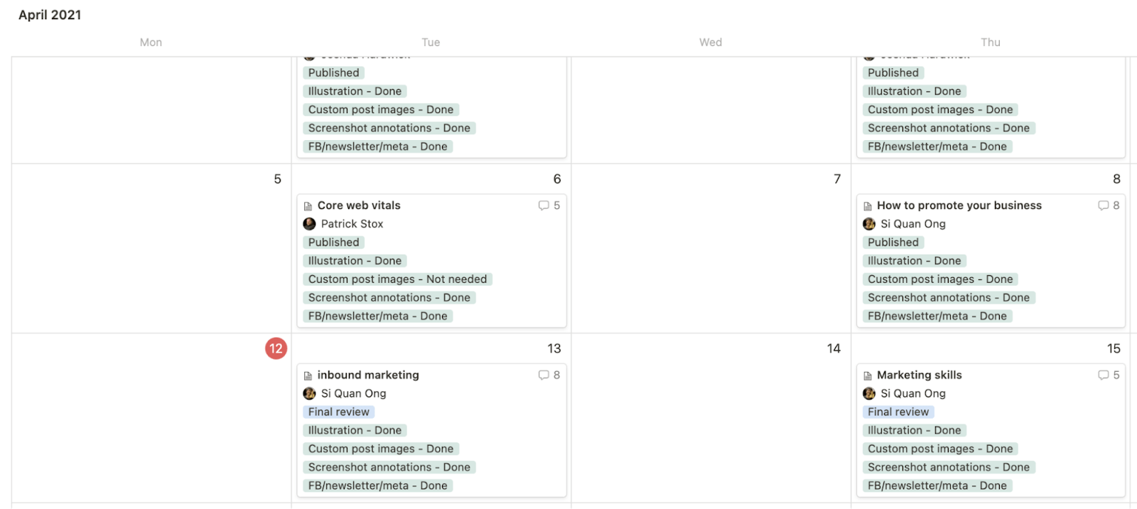 - 新旧作品都有。例如,如果你要刷新或优化现有的内容片段,将它们添加到日历中可以确保你计算完成工作所需的时间和资源