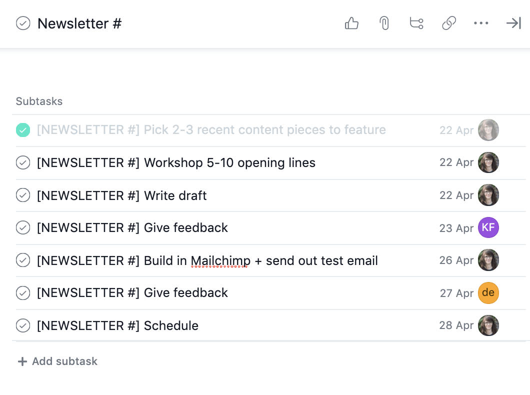 例如,我以前在 Hotjar 的工作中,我通常按照相同的7个步骤发布新闻稿; 对于我计划的每一期新闻稿,我只是复制子任务列表,并将每一期分配给一个具体的团队成员,并指定截止日期: