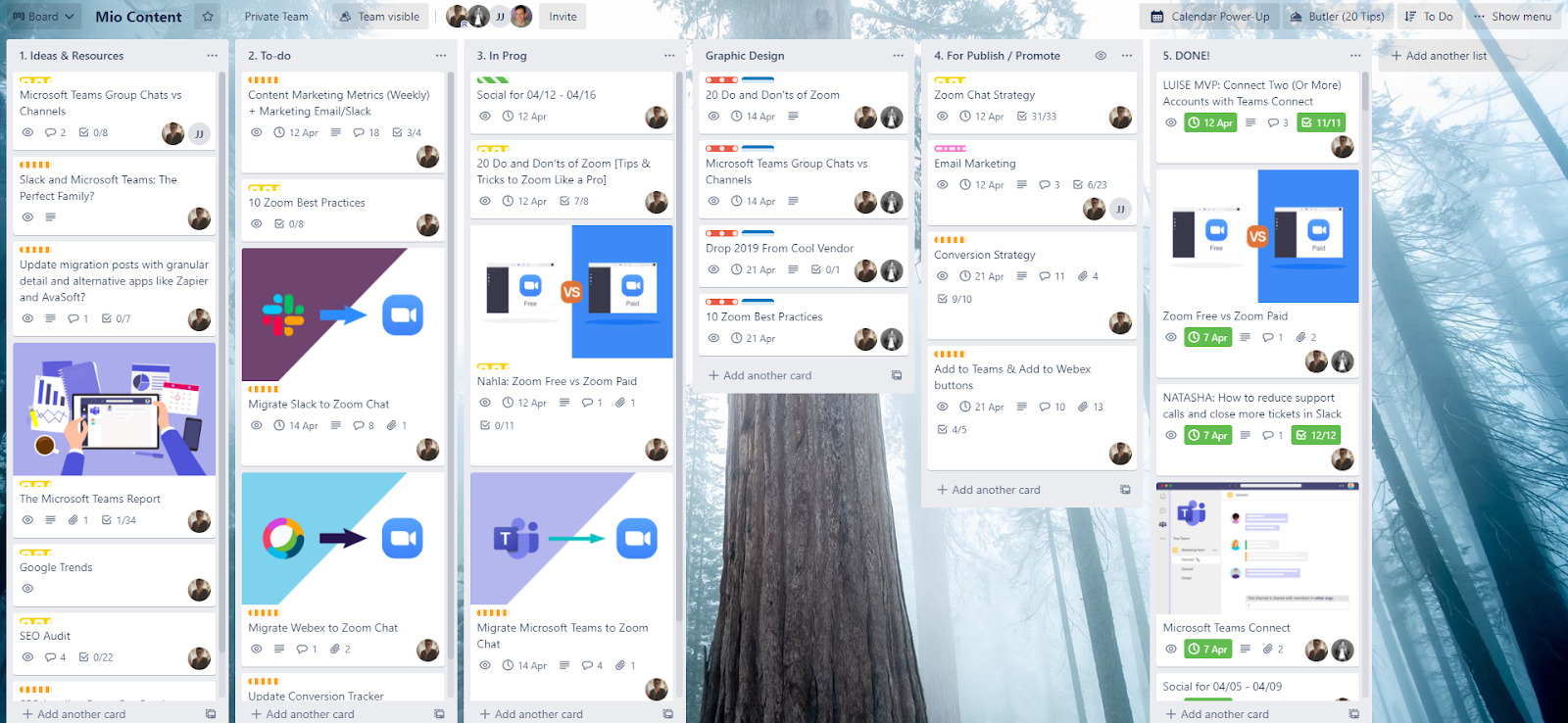 这个Trello板是Dom Kent 在Mio 每天检查多次的地方,以确保所有即将发布的内容保持正常。使用看板样式的日历,每张卡片代表一个内容块,它会在整个板面上移动,直到到达最右边的“完成”列。如果你是一个小团队的一员,并且在流程的每个阶段都需要清晰的视觉效果,那么这个简单的系统工作得很好;还有空间容纳计划外的内容想法(请参阅#1左)。