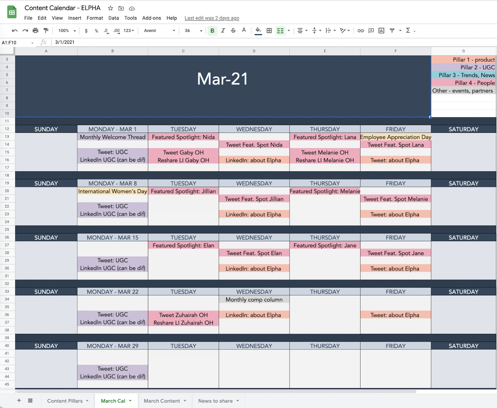 Lani Assaf 在Elpha使用此电子表格来跟踪社交媒体活动和其他内容。 日历使用颜色编码系统,因此每块内容均以四个类别之一(列为“右上角的柱子”),并且团队可以一目了然地看到社交媒体分布。 日历还显示假日和重要日期,例如3月5日星期五的员工升值日。