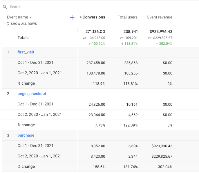 上面的图片显示了2021年第四季度与2020年第四季度(每周对应的一天)的转换率。你可以通过单击蓝色文本,例如单击 purchase (购买), 深入到特定的转换。