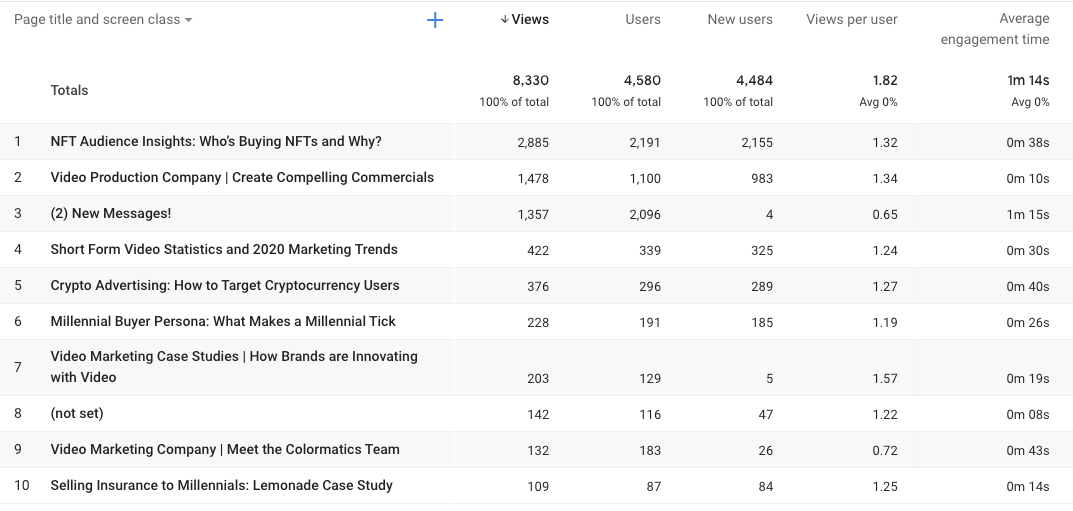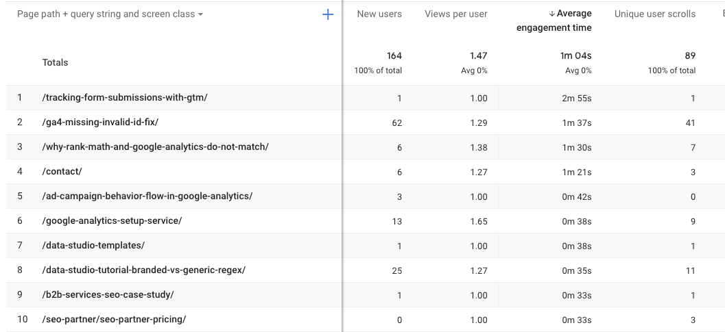 向下滚动,查看页面标题表。你将看到视图和参与度指标,如平均参与时间和唯一用户滚动在这里。
