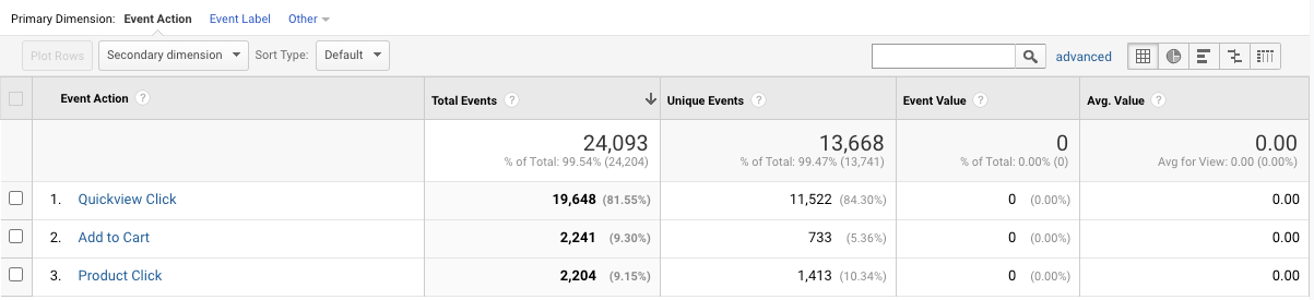 对于本例,我们将选择 Enhanced Ecommerce 事件类别。现在我们看到事件动作。事件动作将告诉我们用户做了什么。