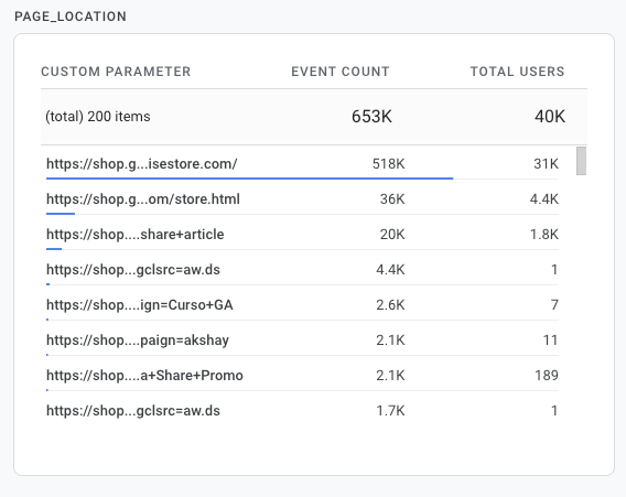 目前,GA4中提供的信息是有限的。我们可以单击事件名称来查看按国家、会话和页面位置分列的事件计数。但是我们不能打开 Page Location 瓷砖从数据中得到任何有用的信息。